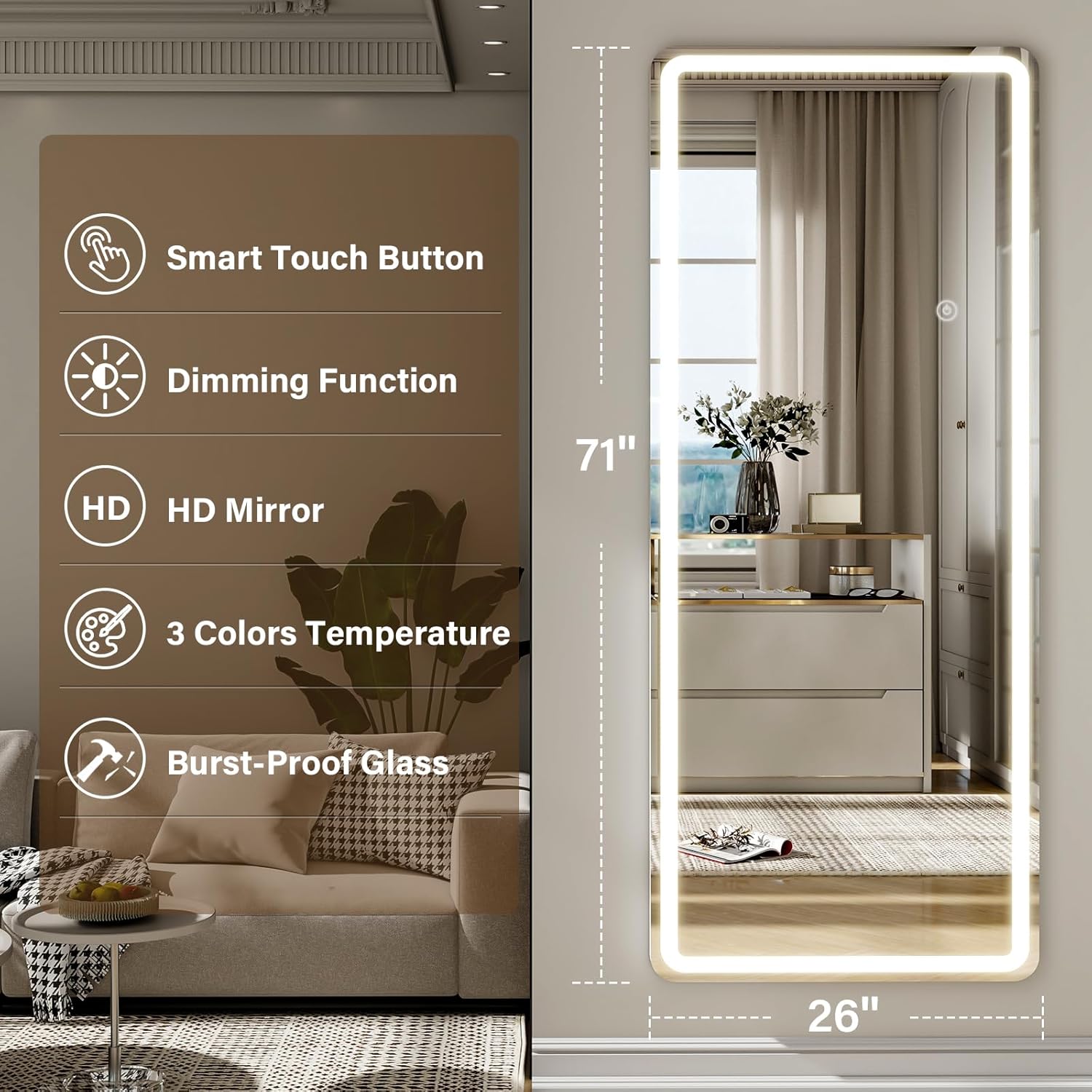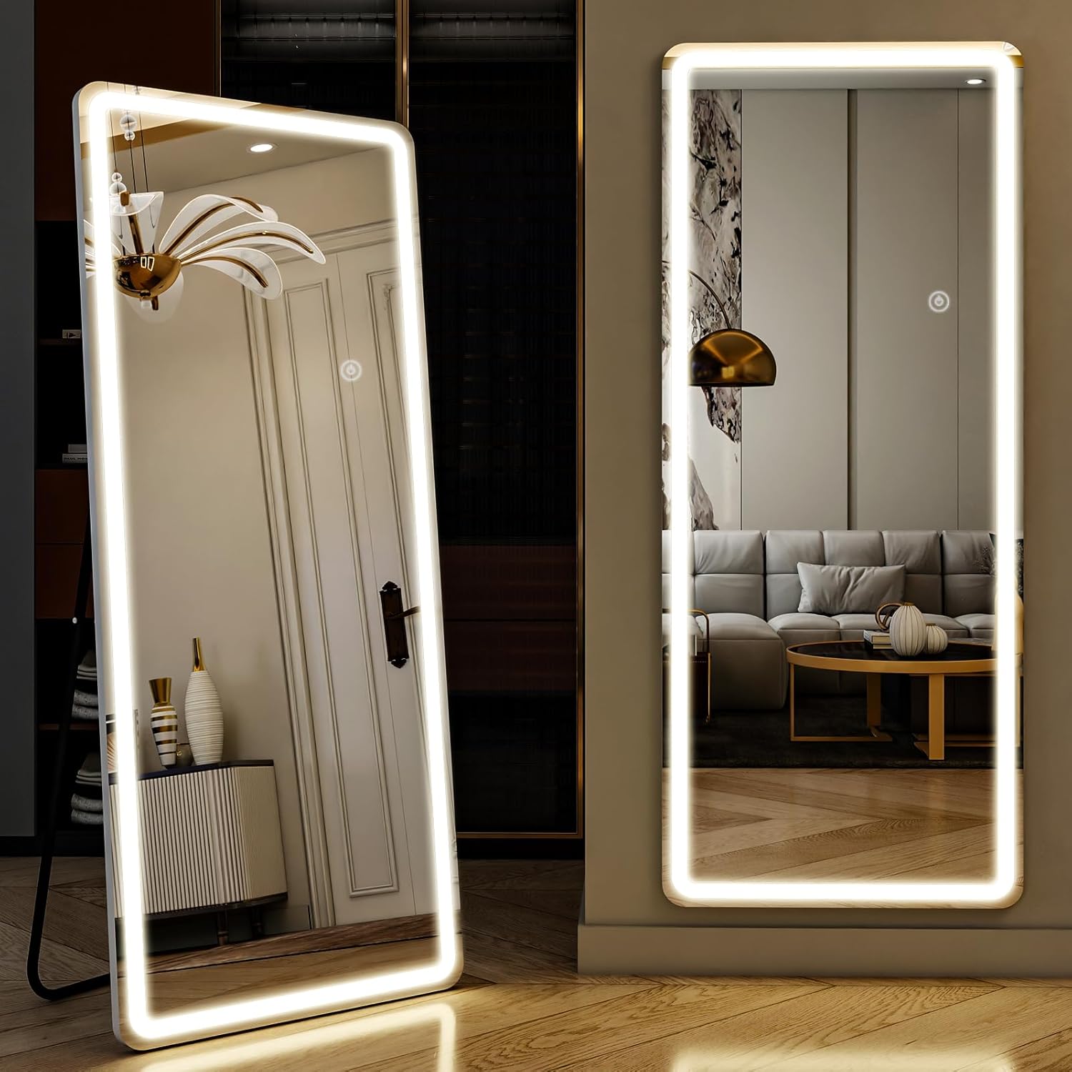 - 【Full Length Mirror Oversized View】Full length LED mirror provides focused, bright light convenient for your skincare and make-up, the large mirror surface allows for a complete display of dressing and fitness poses