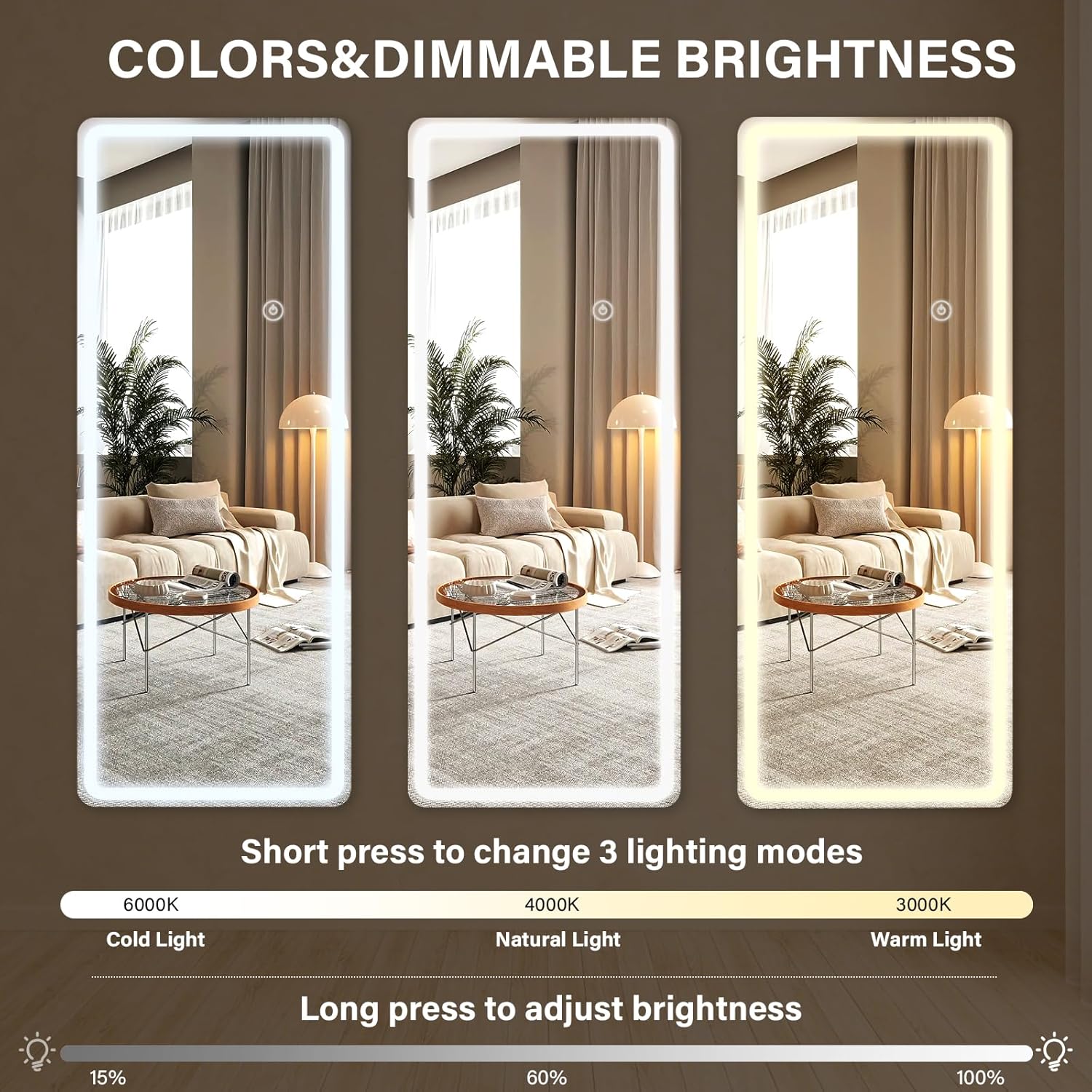 - 【Touch Buttons & Smart Dimming】The brightness and light temperature of the mirror are controlled by smart touch buttons. A short press on the touch switch adjusts the colour temperature to white, warm and yellow light. A long press on the switch for a few seconds adjusts the brightness to your preferred level