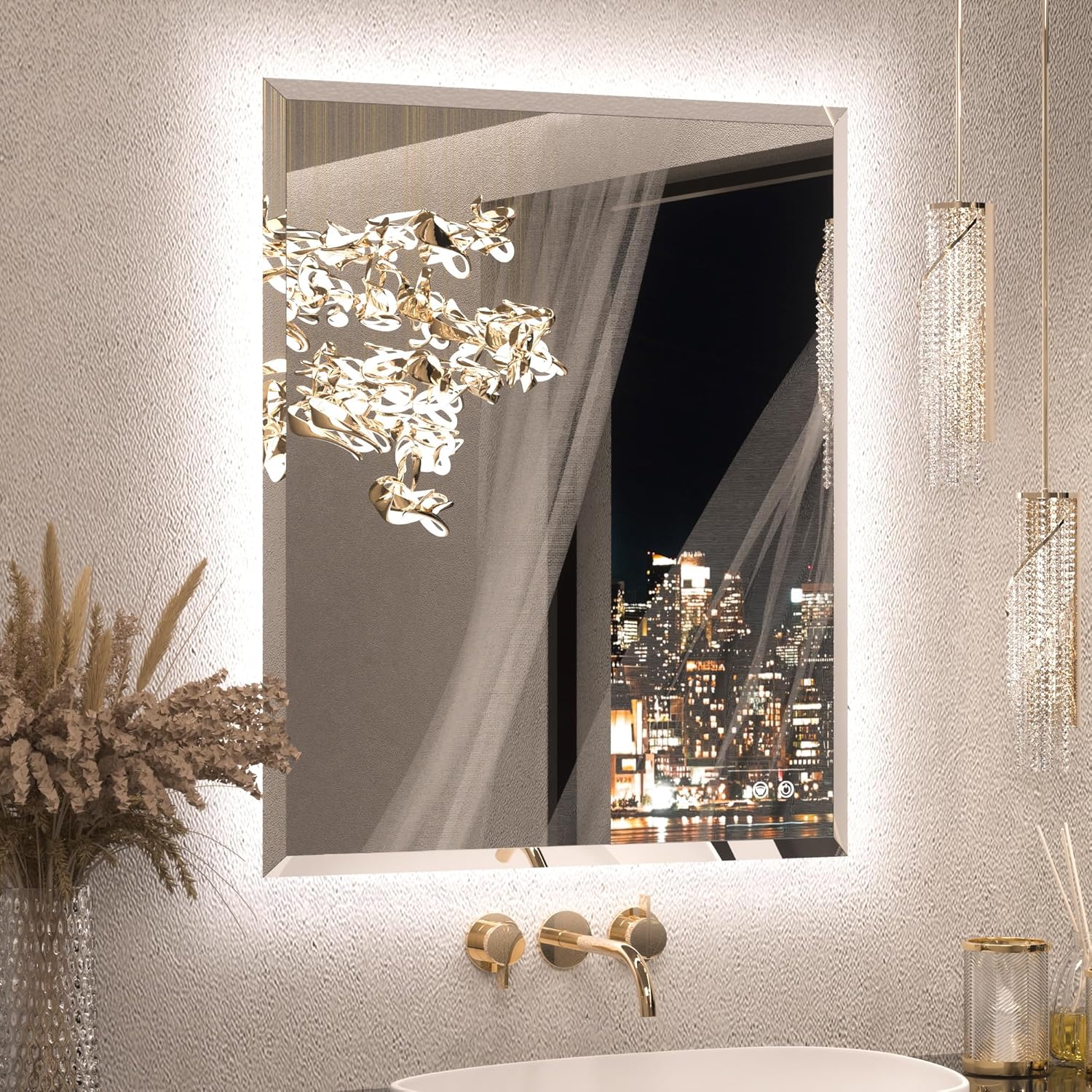 - 【Modern Beveled Edge in HD Tempered Glass】Sleek and frameless, this crystal-clear backlit mirror highlights a sophisticated beveled edge that reflects light with elegance and adds sculpted dimensional beauty. Crafted from 4mm HD tempered glass, it's shatter-proof, moisture-resistant, and built for long-term use in humid environments.