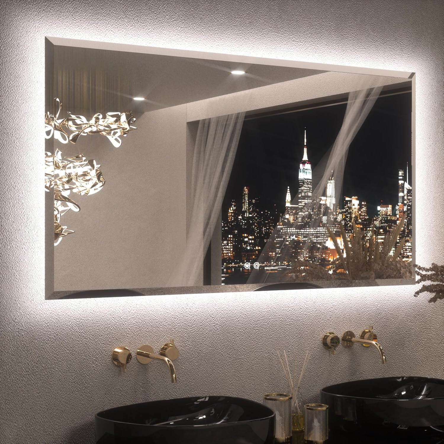 - 【Modern Beveled Edge in HD Tempered Glass】Sleek and frameless, this crystal-clear backlit mirror highlights a sophisticated beveled edge that reflects light with elegance and adds sculpted dimensional beauty. Crafted from 4mm HD tempered glass, it's shatter-proof, moisture-resistant, and built for long-term use in humid environments.