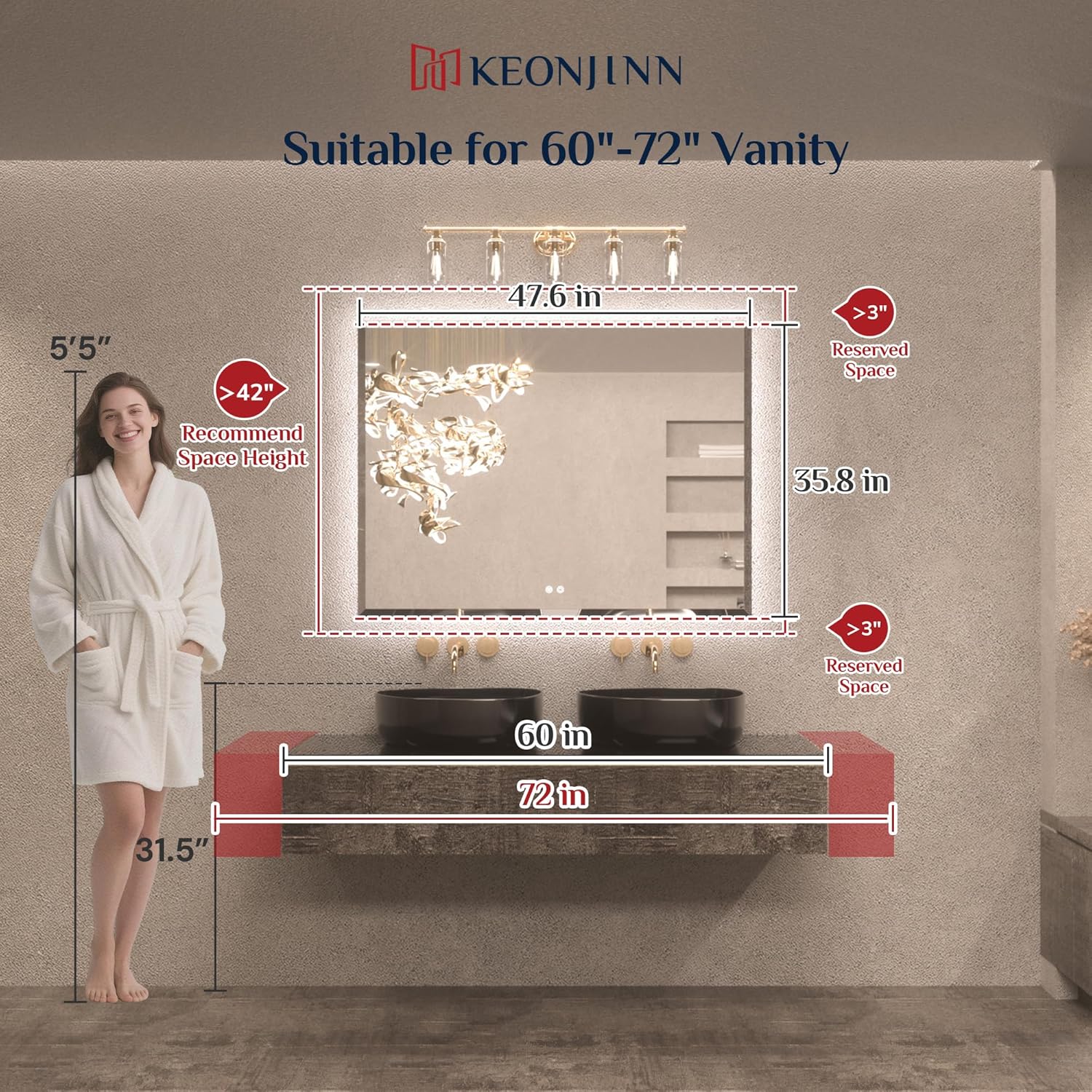 - 【Effortless Installation & Expert Support】Mount the LED mirror with ease using the included French cleats and hardware for both vertical and horizontal installation. Different screws are inclueded to suit various wall types. A rear wiring groove keeps power cords neatly routed, ensuring the mirror sits flush against the wall. Need help? As a trusted brand Keonjin in mirror category, our responsive 24/7 customer service team is always here with solutions you can count on.