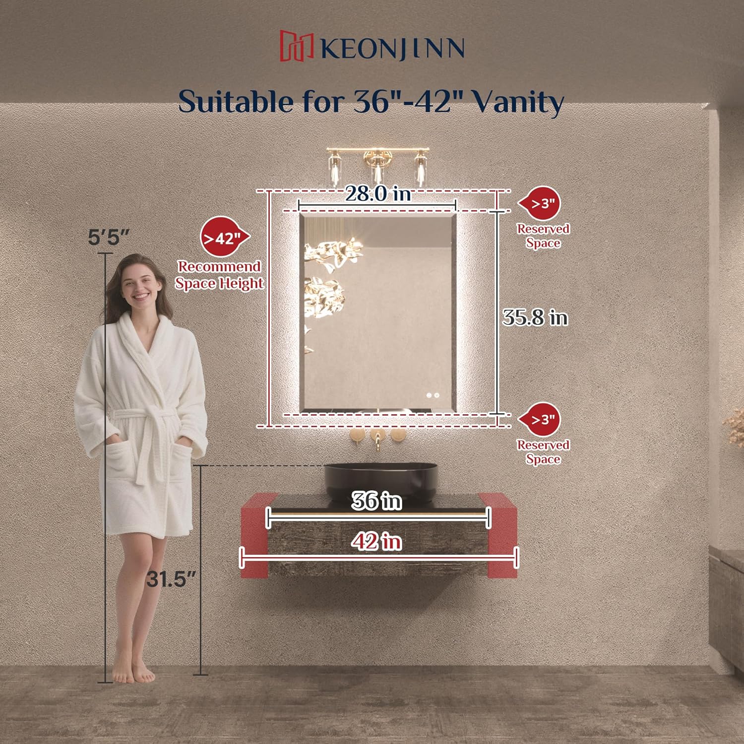 Keonjinn LED Backlit Mirror 28 x 36 Inch, Frameless LED Mirror with Beveled Edge, Tempered Glass, UL-Listed Power Driver, 3 Color Lights, Anti-fog, Dimmable, Memory Function, French Cleat Installation