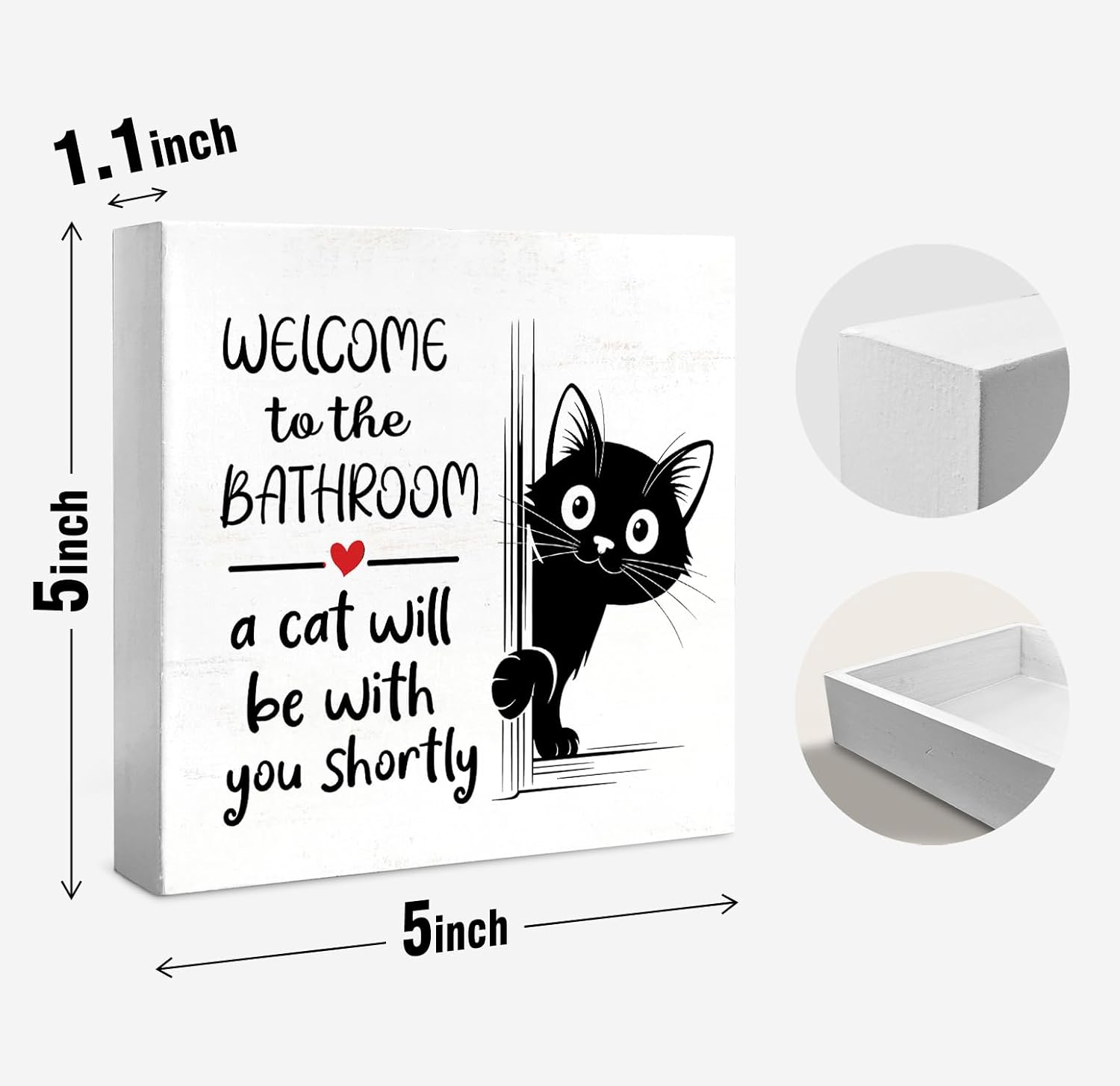 Funny Bathroom Black Cat Wall Decor Desk Wood Sign, Cat Decor for Home Welcome to the Bathroom Sign, Gifts for Women Cats Lovers, Welcome To The Bathroom A Cat Will Be With, 5x5 inch