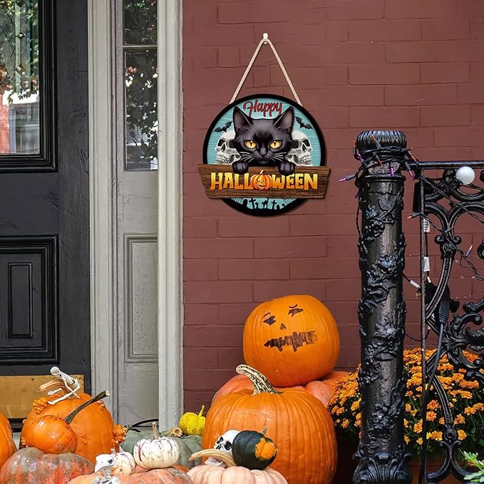 - Happy Halloween Door Sign: This Halloween cat door sign is designed in 3D. It is mainly composed of black cats, skull, bats, and pumpkins, with the word [Happy Halloween].It is very suitable for the atmosphere of Halloween. This is an interesting Halloween room decoration that can enhance the festive atmosphere of your home