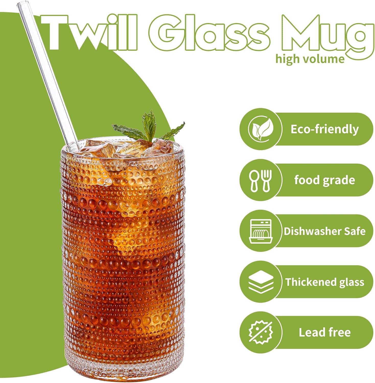 - [16oz Large Capacity 6-Piece Set]: Features 6 classic 16oz (approx. 473ml) vintage hobnail glass tumblers, complete with 6 glass straws, a glass brush, and a straw brush. The perfect size (approx. 5" tall) effortlessly handles lemonade, milkshakes, cocktails, whiskey, juice, iced coffee, and all your favorite hot or cold beverages