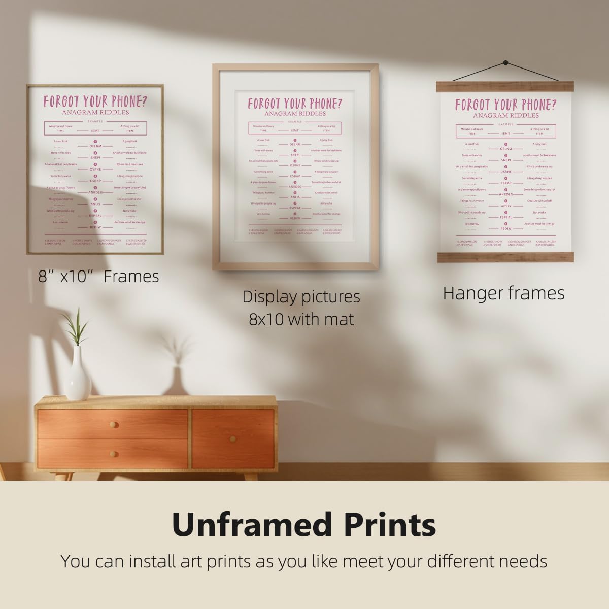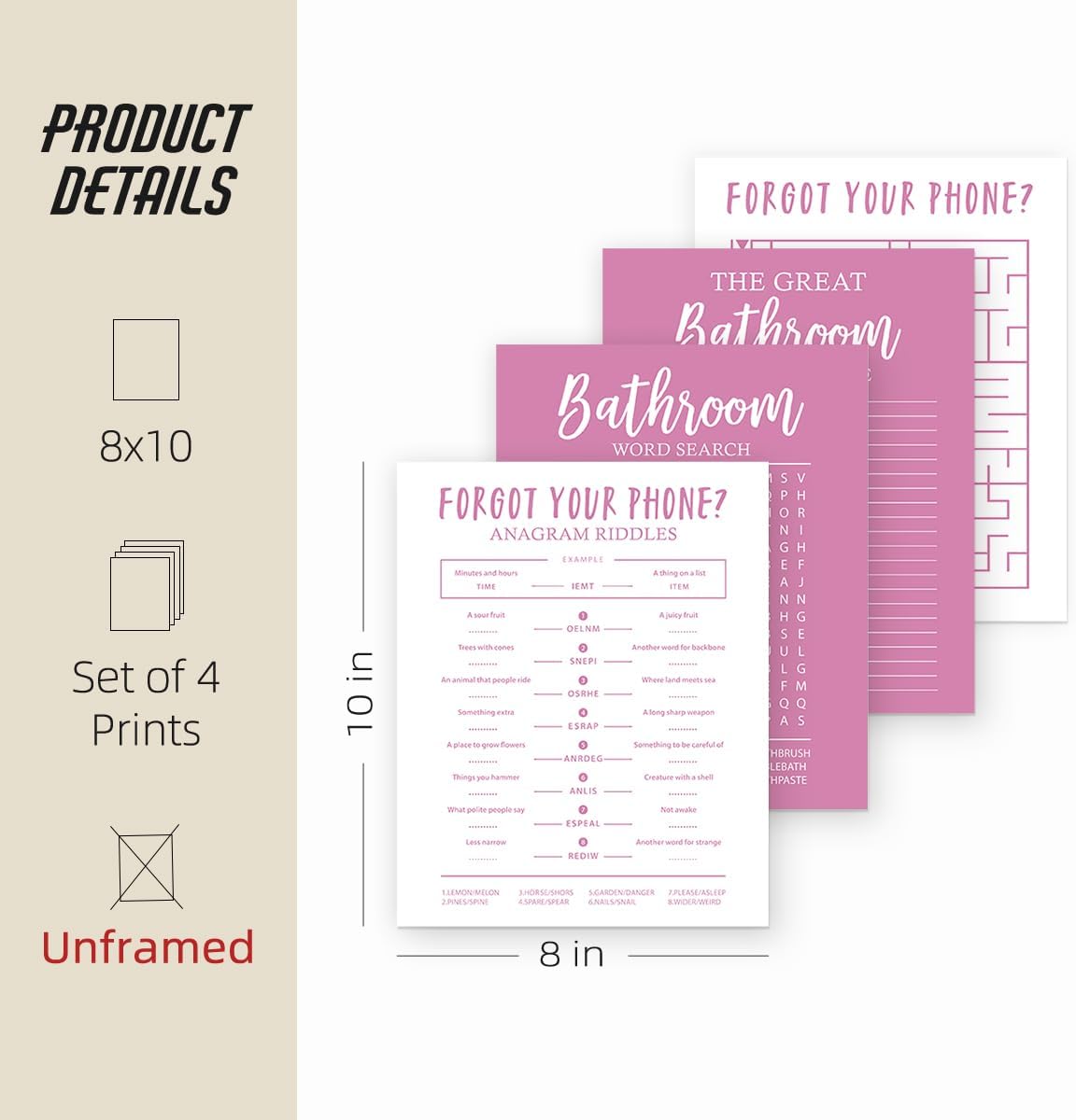 ETVISO Funny Pink Bathroom Decor Wall Art Set of 4, Funny Crossword Puzzle Wall Art, Funny Forget Your Phone, Bathroom Word Search Wall Decor, 8x10 (Unframed)