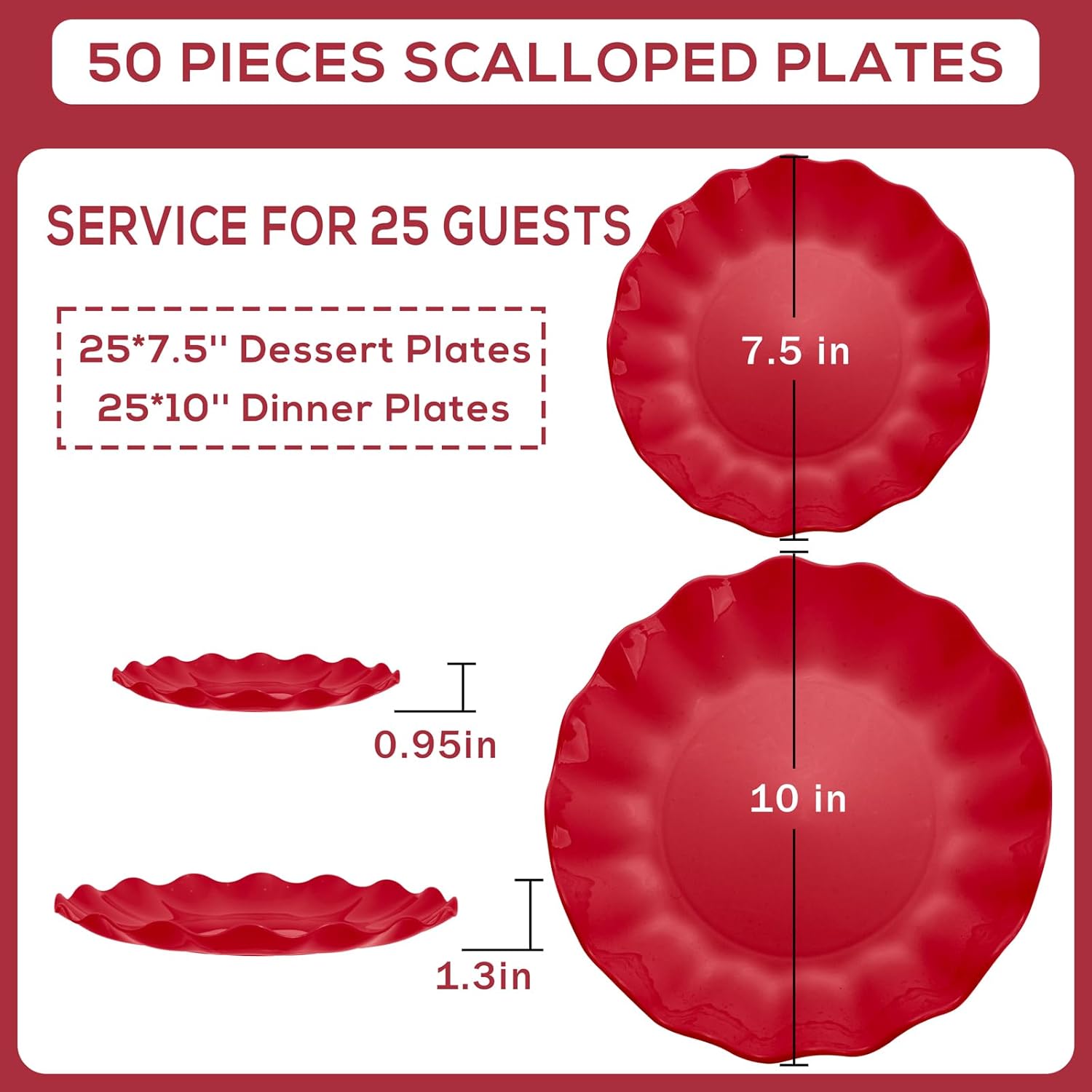 LIYH 50 Pcs Red Plastic Plates Reusable Christmas Plastic Plates Unbreakable Holiday Dinnerware Set Scalloped Plate for Christmas Day,Dishwasher Safe BPA Free (25Guests)