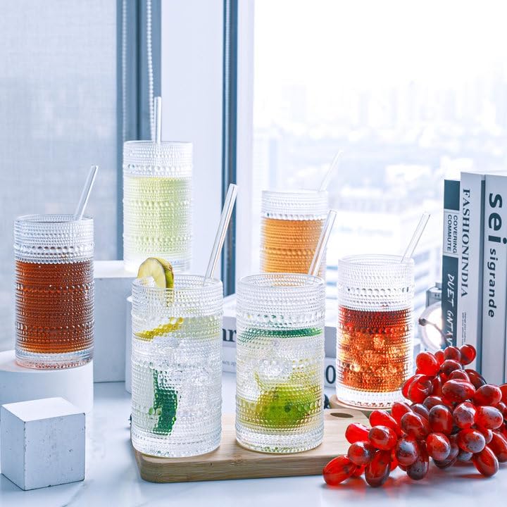 - 12-Piece Hobnail Glass Set: Includes 12 hobnail drinking glasses (16 oz each) and glass straws—ideal for water, juice, or any favorite beverage, meeting daily and entertaining needs.