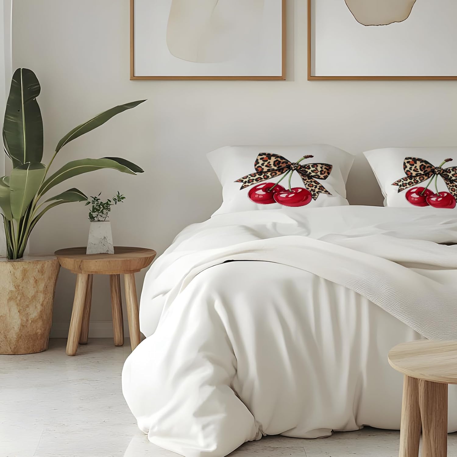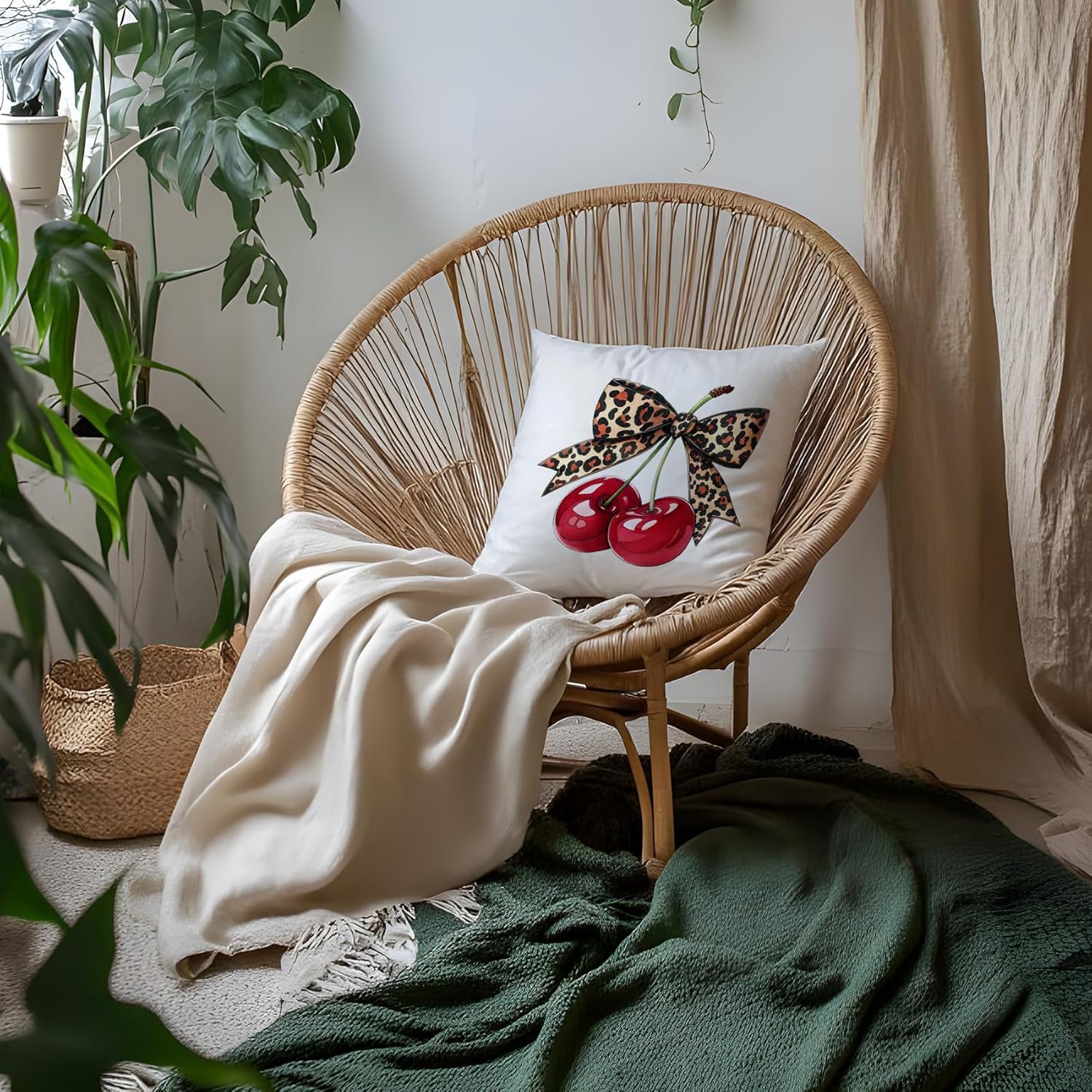 Coquette Leopard Bow Cherry Pillow Covers 18x18, Coquette Cheetah Print Room Decor, Preppy Girly Trendy Leopard Ribbon Cherry Decorative Throw Pillow Covers for Girls Dorm Apartment