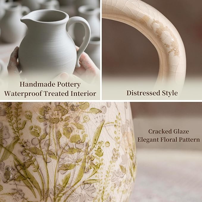 Vintage Green and Beige Ceramic Pitcher Vase with Handle, Farmhouse Floral Decorative Vase, Rustic Table Centerpiece for Home Decor, Living Room, French Country Grand Millennial Decor 8.7 in
