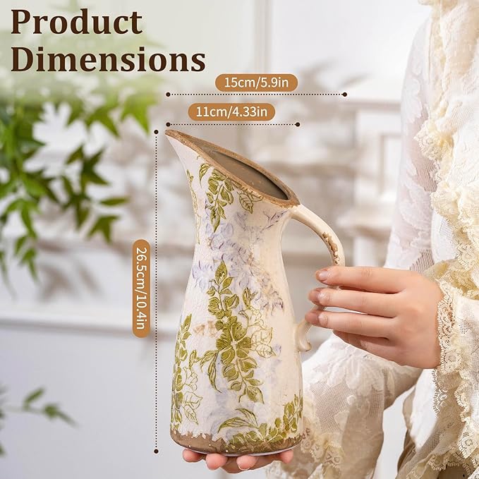 Vintage Ceramic Pitcher Vase with Handle, Farmhouse Green and Purple Large Floral Vases, French Country Decorative Vase, Rustic Table Centerpiece for Home Decor, Bookshelf, Office 10.5 Inch