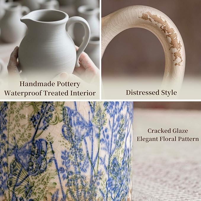 - Handcrafted Blue Floral Pitcher Vase: SURE YUESI's ceramic vase showcases delicate light blue and navy floral motifs on a creamy beige base, embodying vintage farmhouse charm with Chinoiserie-inspired artistry. The pitcher vase silhouette elevates classic floral vase designs for timeless vintage home decor.