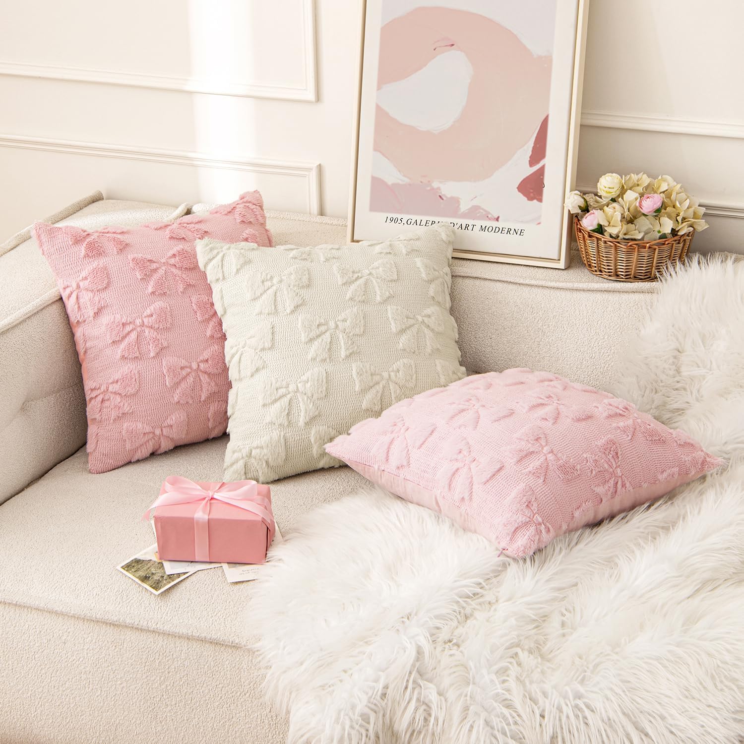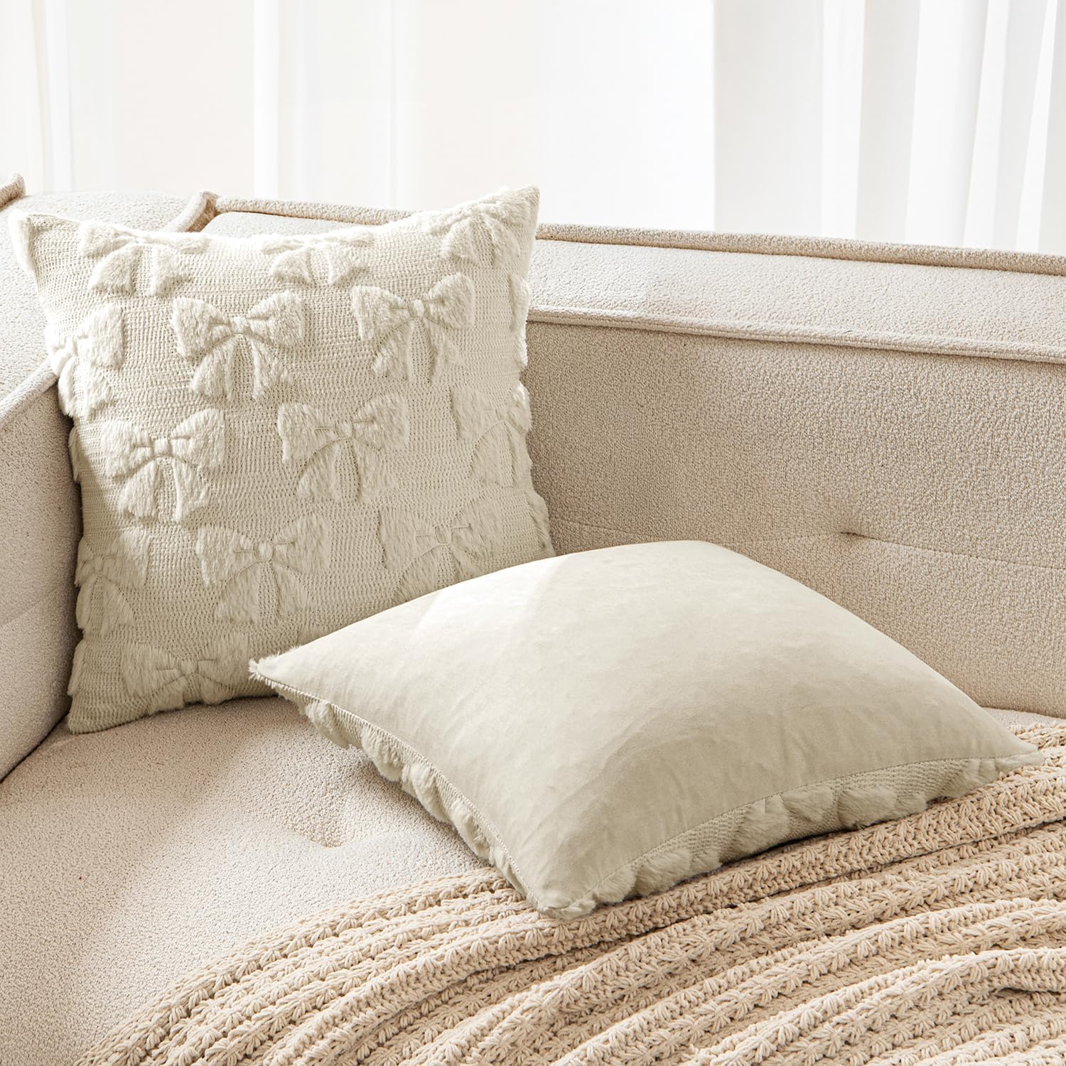 MIULEE Beige Bow Pillow Covers Christmas Coquette Room Decor Aesthetic Set of 2 Decorative Cute Girl Throw Pillow Soft Plush Faux Pillowcase for Girl Bed Couch Sofa,18x18 Inch