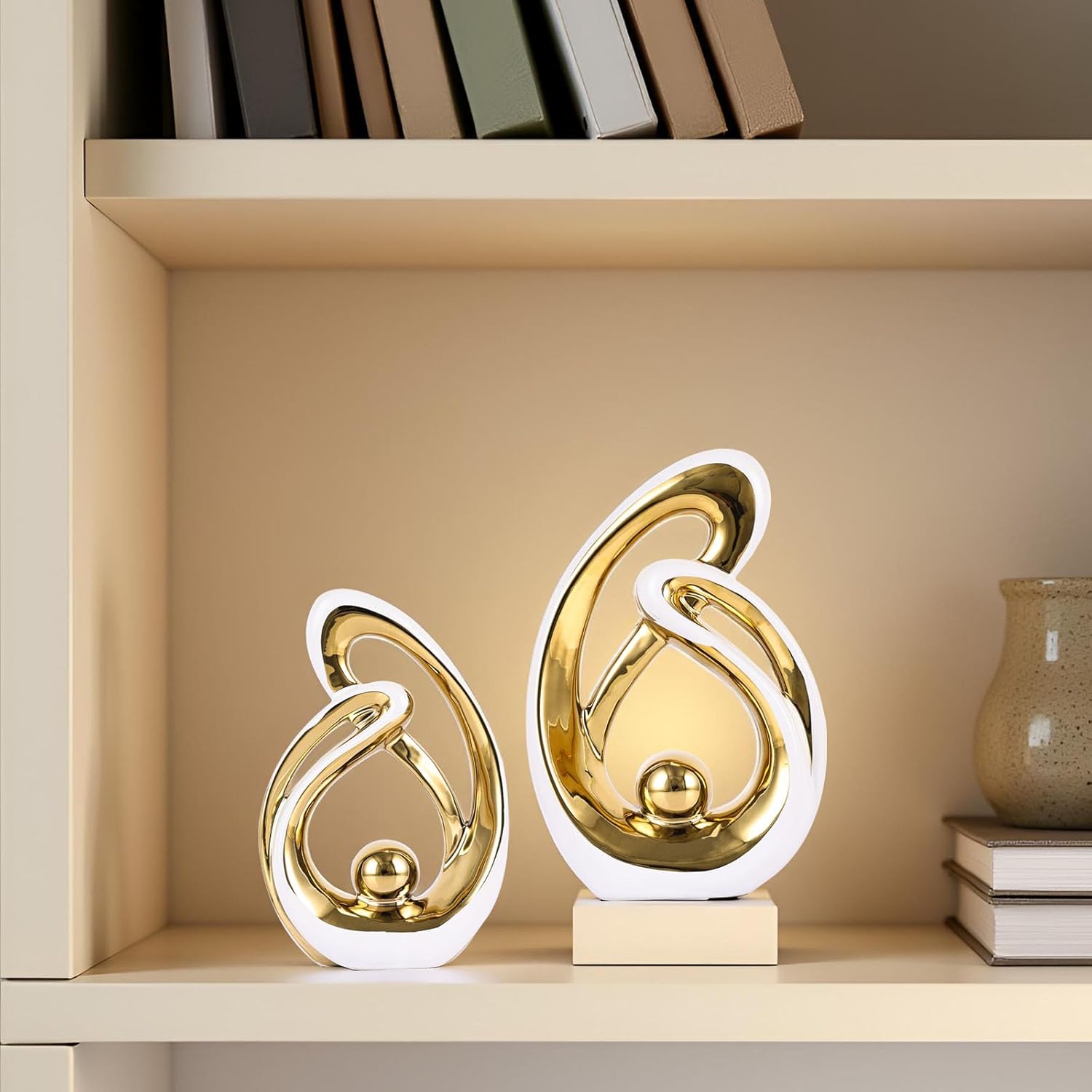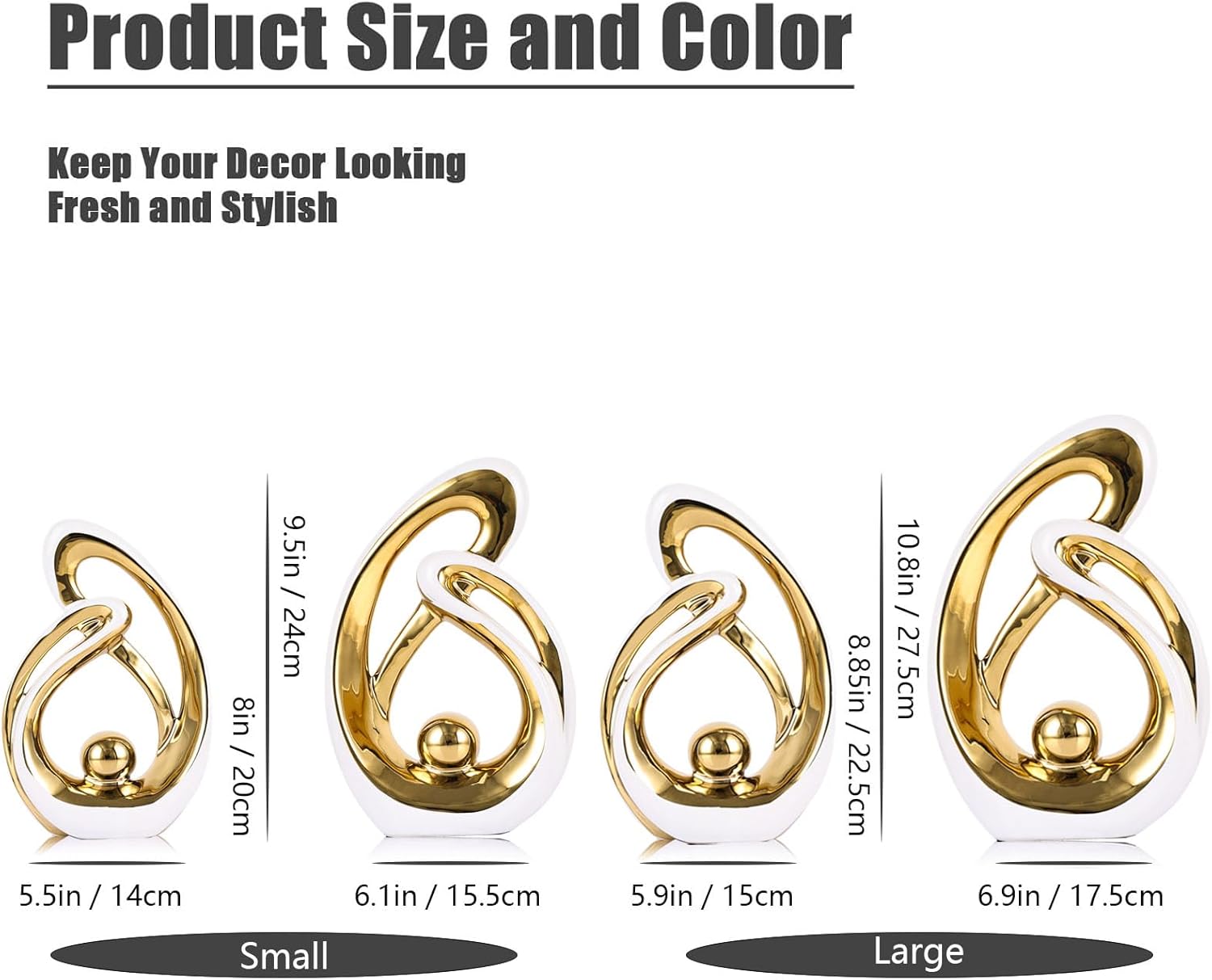 - 【Handcrafted Ceramic Decor Piece】 Gold Ceramic Abstract Art Sculpture Set (2-Piece Set) — Large Set: (Tall: 10.8 x 6.8 x 2.36 inches, Short: 8.85 x 5.9 x 2.16 inches), Small Set: (Tall: 9.6 x 6.1 x 2.36 inches, Short: 8.1 x 5.4 x 2.16 inches) Handmade ceramic decorative items are an ideal choice for home decor, gifts, or as centerpieces in restaurants, living rooms, or offices.