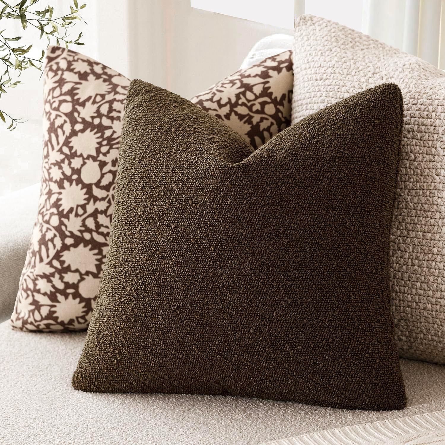 Foindtower Pack of 2 Textured Boucle Throw Pillow Covers Accent Solid Pillow Cases Cozy Soft Decorative Couch Cushion Case for Chair Sofa Bedroom Living Room Home Decor 18x18 Inch Chocolate