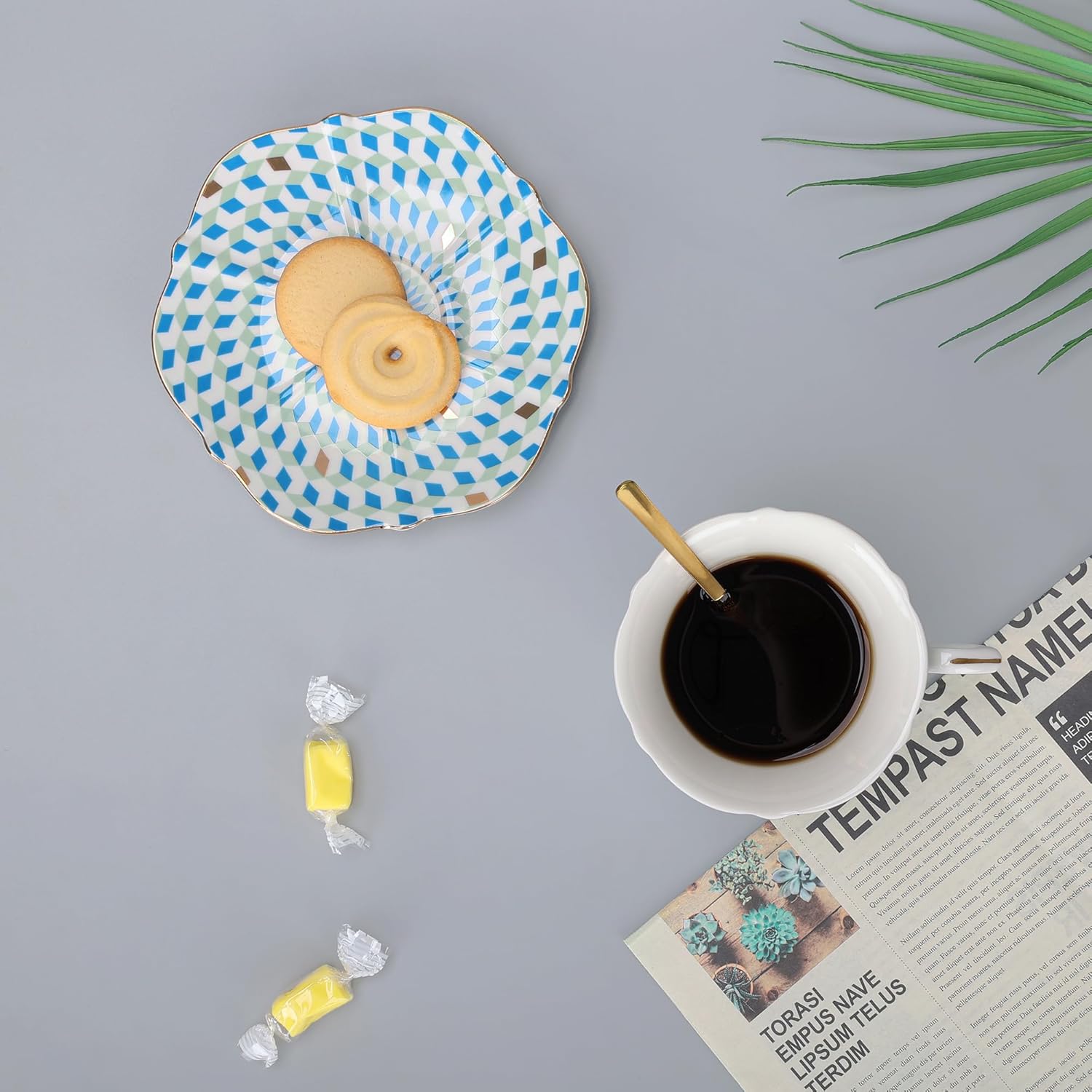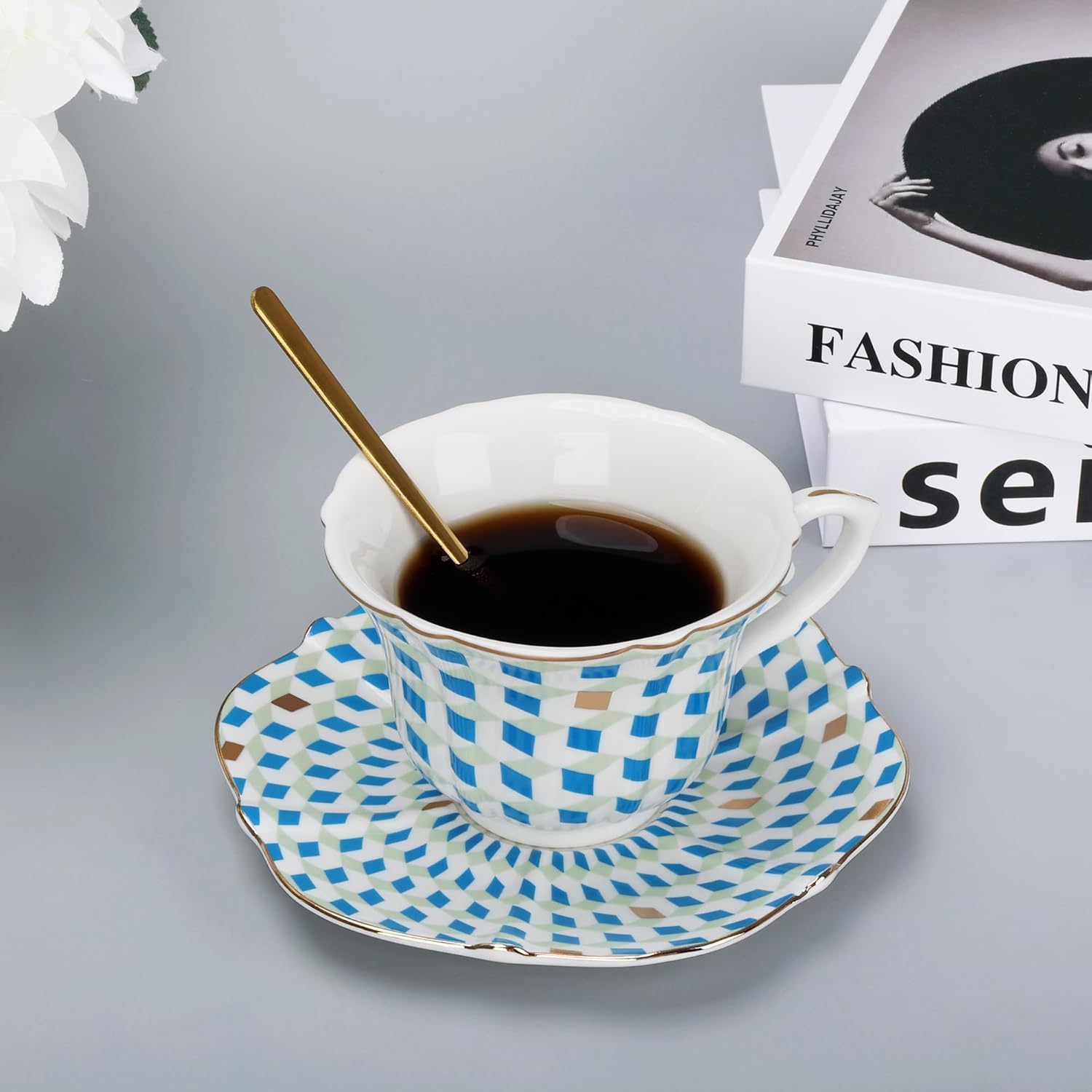 fanquare 6 oz Modern Tea Cup and Saucer Set with Spoon, Blue and White Geometric Pattern Porcelain Coffee Cup, Classic Teacup for Women Tea Party