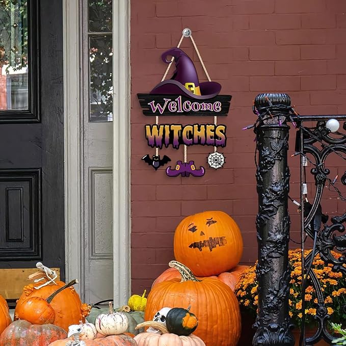 - Halloween Witch Theme Door Decor: This carefully designed witches welcome door sign incorporates rich Halloween elements such as witch hat, boots, spider web and bat. Equipped with the welcome word [Welcome Witches], it showcases the mysterious and terrifying atmosphere of Halloween, making it perfect for decorating Halloween parties