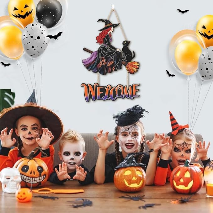 - Witch Halloween Welcome Door Decor: This Halloween witch’s broom design combines iconic Halloween symbols such as witch,hat,broom,black cat and features the welcome word.The beautiful image of the witch creates a mysterious Halloween atmosphere. It is the perfect choice for creating a Halloween atmosphere
