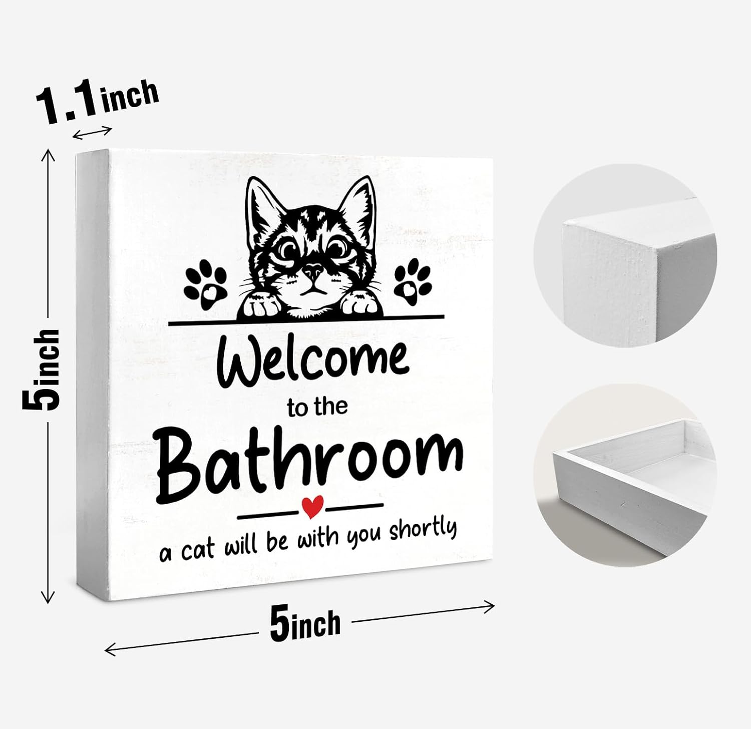 Funny Tabby Cat Bathroom Decor Art Wall Desk Decor Wood Box Sign, Bathroom Signs, Welcome To The Bathroom A Cat Will Be With, Cats Lover Gifts, 5x5 inch