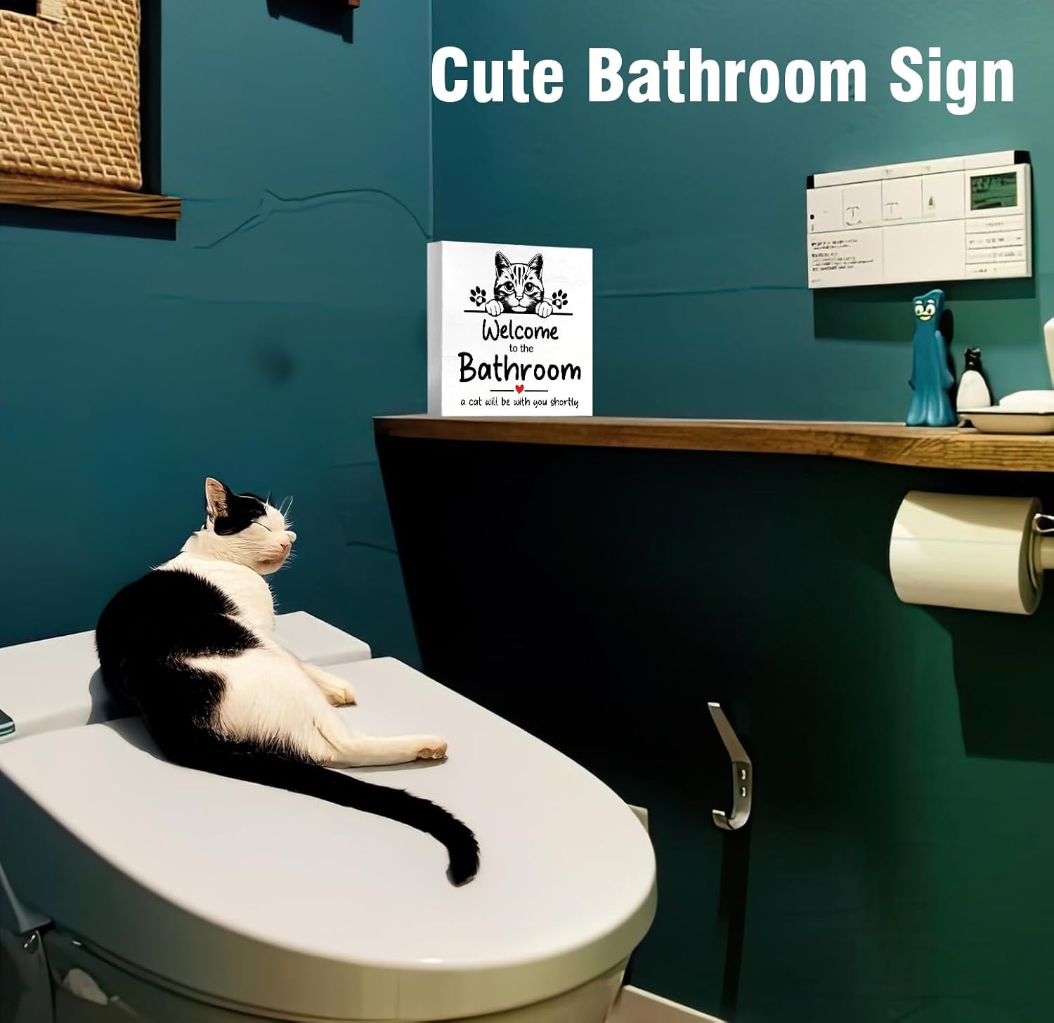 Funny Bathroom Cat Decor Wall Desk Wood Box Sign, Welcome To The Bathroom A Cat Will Be With, Gifts for Women Cat Lovers, 5x5 inch