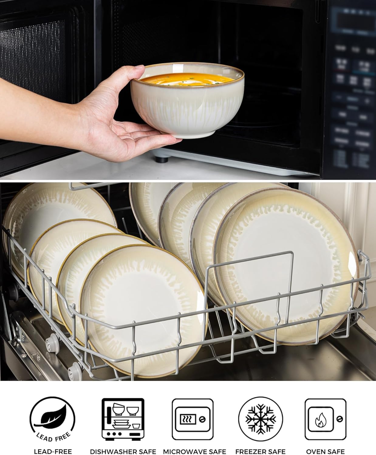- 【LEAD FREE EAT SAFTY】Our plates and bowls set is made of druable material and features an all-natural glaze that is lead-free, cadmium-free. The set is fired at a high temperature of 2340℉ for 17 hours to ensure its durability and safety. With this dinnerware set, you'll never have to worry about any health problems.