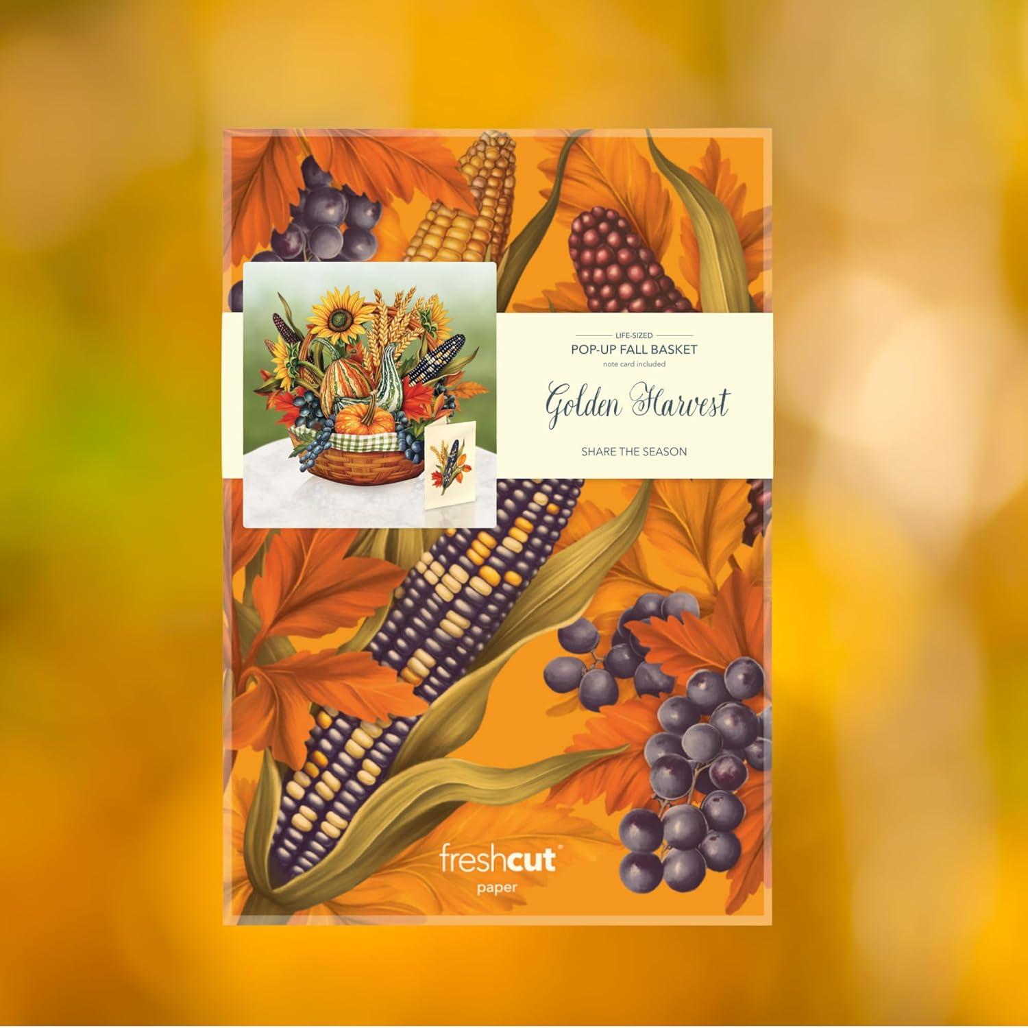 - GOLDEN HARVEST BOUQUET of pop-up yellow sunflowers and pumpkins, corn cobs, and gourds in a wicker basket unfold in your hand. Comes with blank note card that is the perfect gift card holder for birthdays, anniversaries, autumn, or everyday.