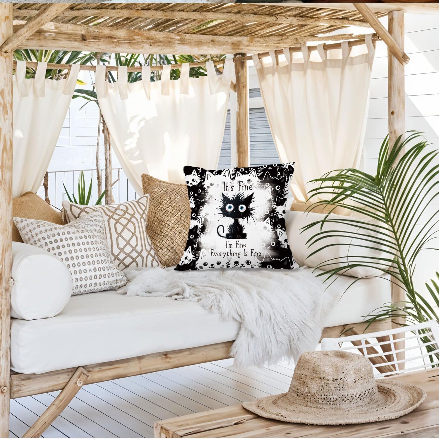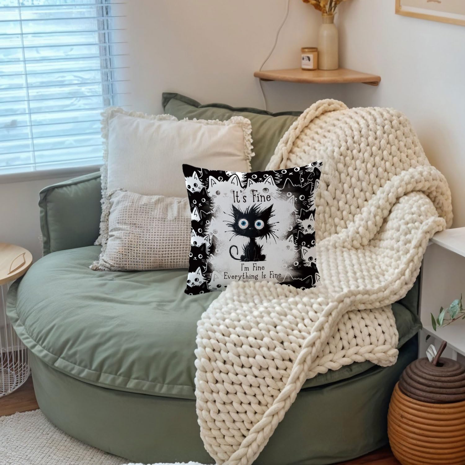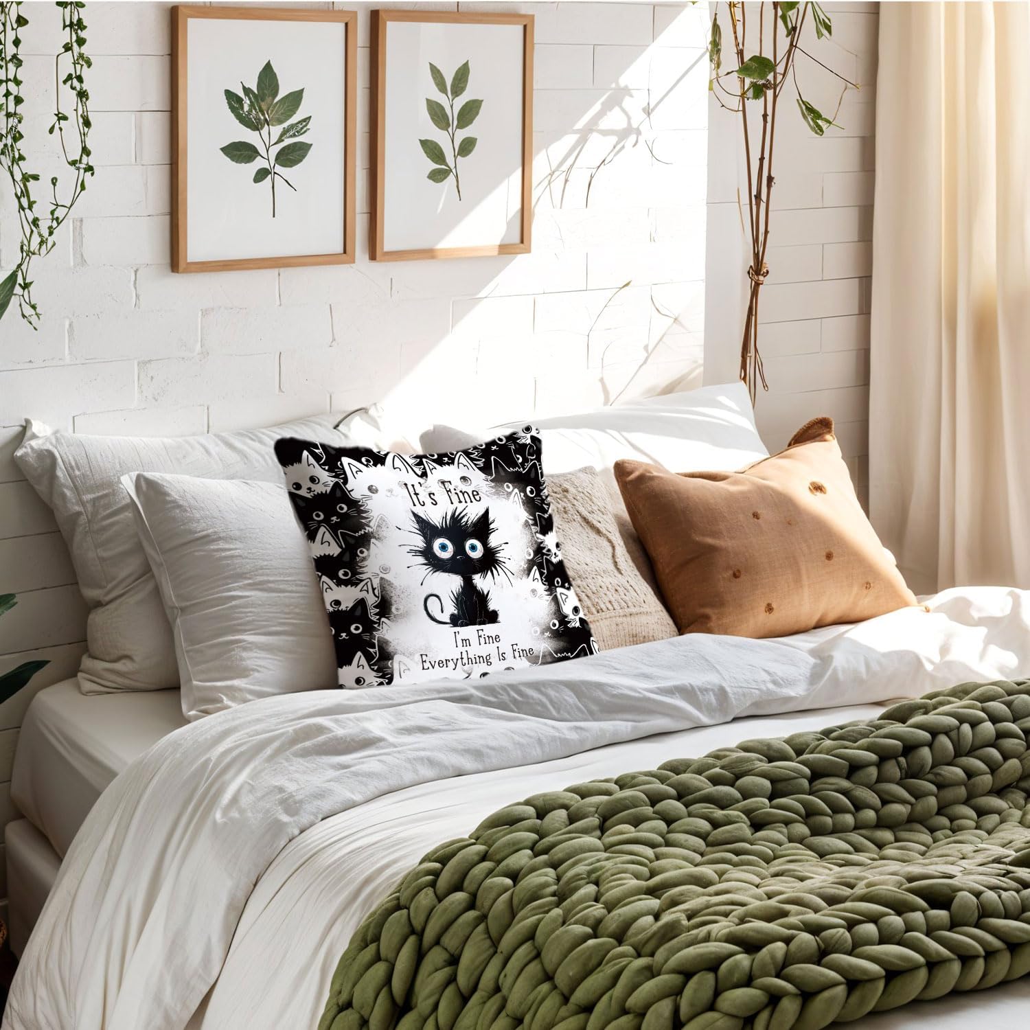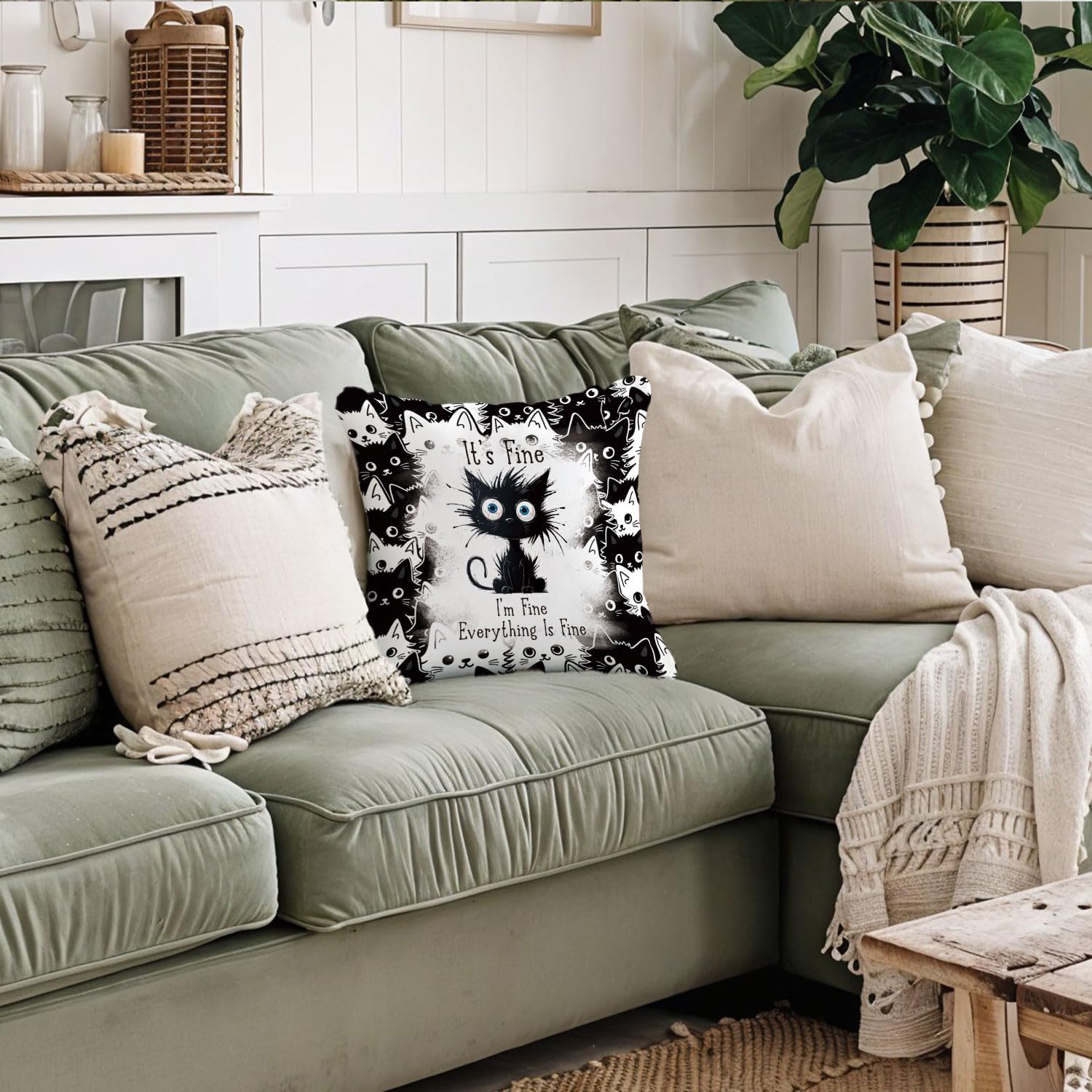 Funny Black Cat Pillow Covers 18x18, Black Cat Decor, It's Fine I'm Fine Everything is Fine Decorative Throw Pillow Covers Pillowcases for Bedroom Living Room Home Decor