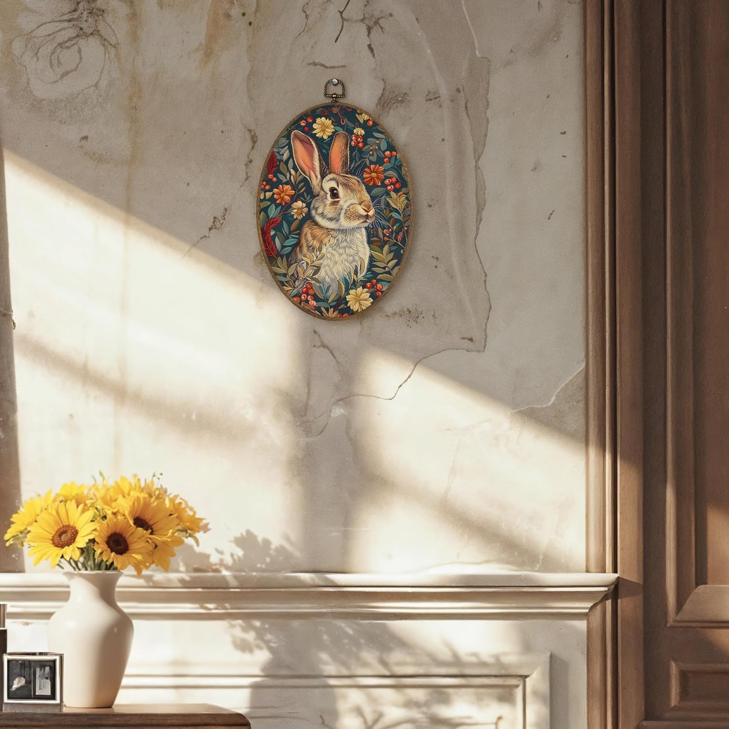 LKETW Floral Bunny Oval Wall Art Decor, Cottagecore Bunny Floral Botanical Oval Canvas Hanging Decor, Rustic Retro Rabbit Wall Decorations for Home Bedroom Living Room, 8.6x11.4 Inch