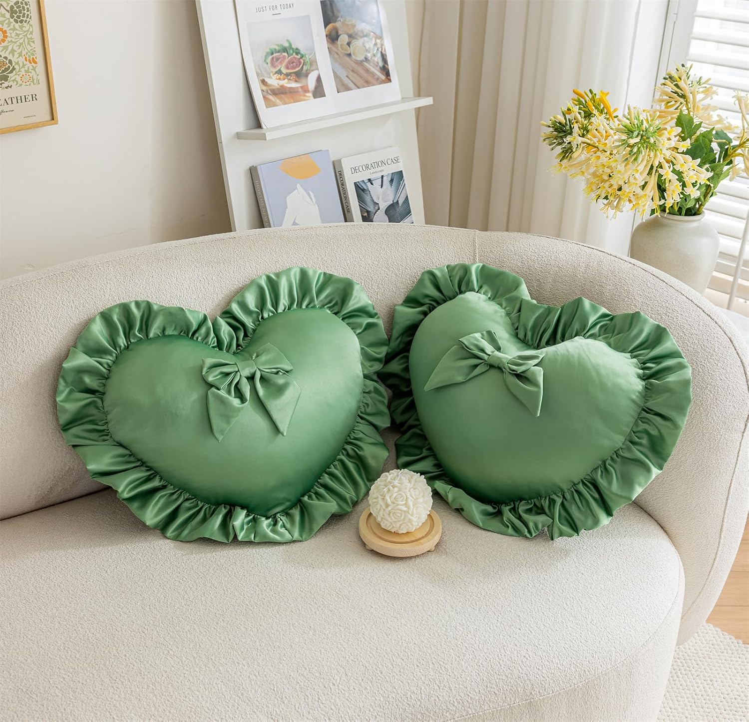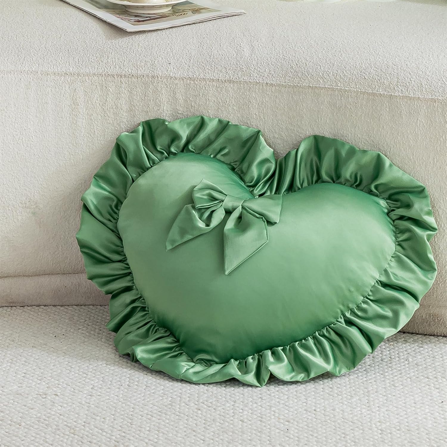 Heart Pillows, Cute Ruffled Heart Shaped Throw Pillows with Bow Soft Stuffed Love Decorative Pillow Cushion for Sofa Couch Bed Girl Room Chair Car Living Room, Green