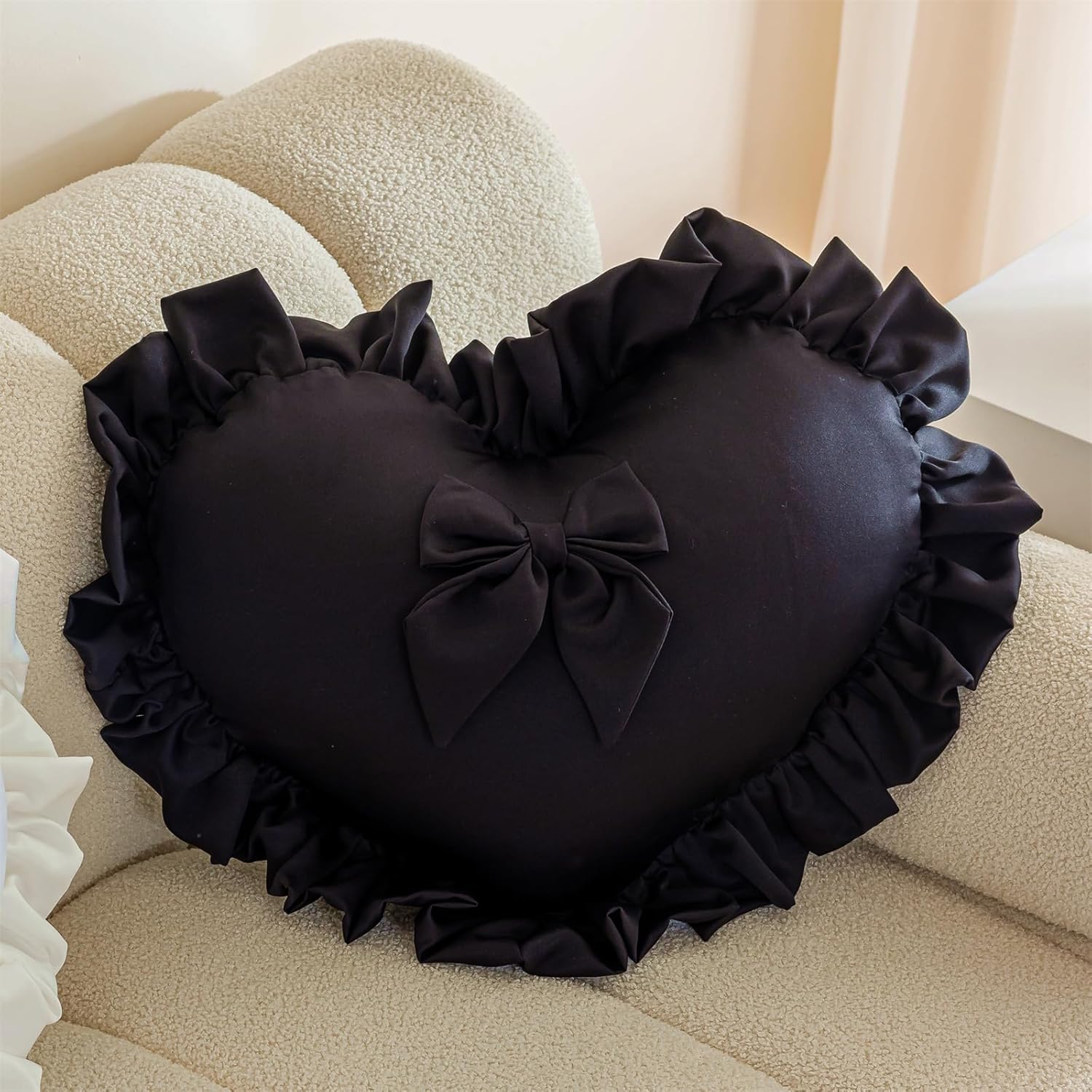 Heart Pillows, Cute Ruffled Heart Shaped Throw Pillows with Bow Soft Stuffed Love Decorative Pillow Cushion for Sofa Couch Bed Girl Room Chair Car Living Room, Black