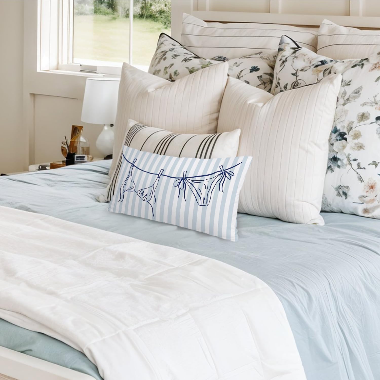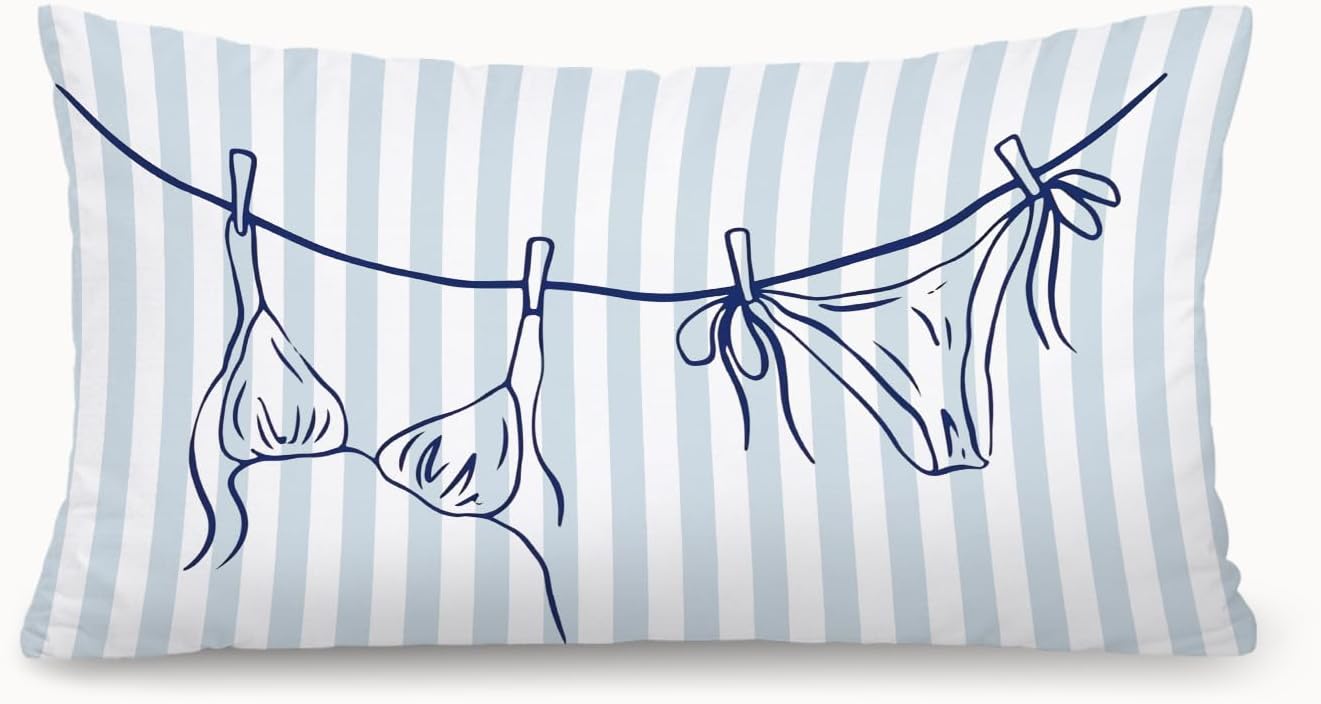 Coastal Beach Girly Room Decor 12x20 Pillow Cover, Preppy Beach Navy Blue Bikini Striped Decorative Lumbar Pillow Covers for Girls Bedroom College Dorm Sofa Couch