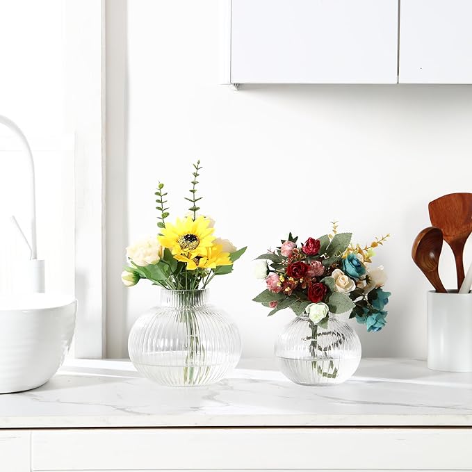 Round Glass Vases Set of 2, Flower Vases for Bouquet, Ribbed Glass Vase for Flowers, Small Clear Vase for Living Room, Office, Coffee Table, Shelf, Wedding