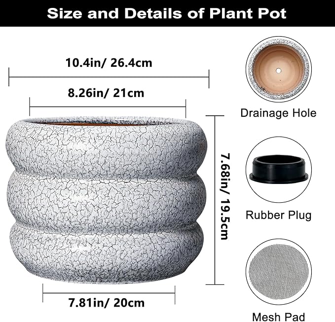 - Suitable Size: The outer diameter of the 10 inch plant pot is 10.4"/ 26.4cm, the inner diameter is 8.3"/ 21cm, and the height is 7.68"/ 19.5cm, is suitable for various indoor and outdoor plants