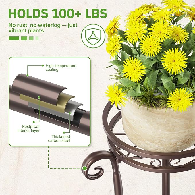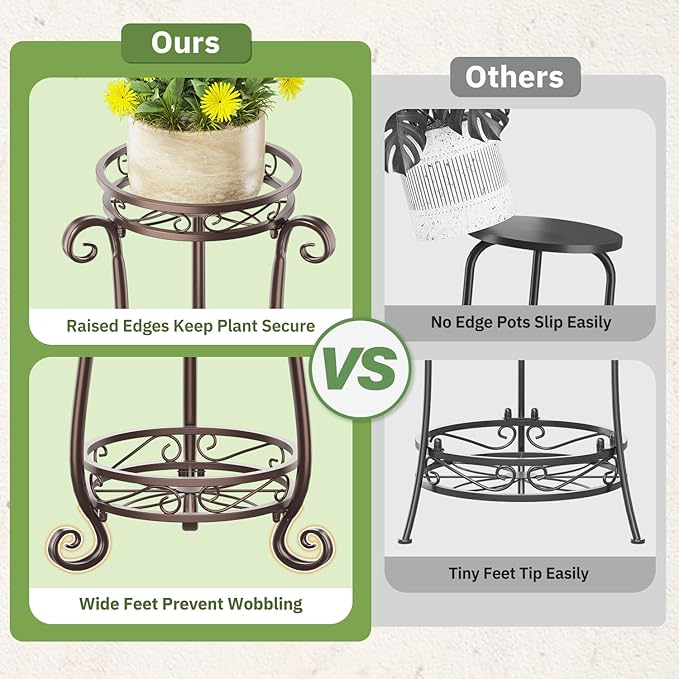 - 【Never Worry About Wobbles】Engineered with a reinforced iron frame and triangular bracing, the metal plant stands outdoor secures heavy planters effortlessly. Its rock-solid foundation keeps plants upright, even with active pets or frequent household movement