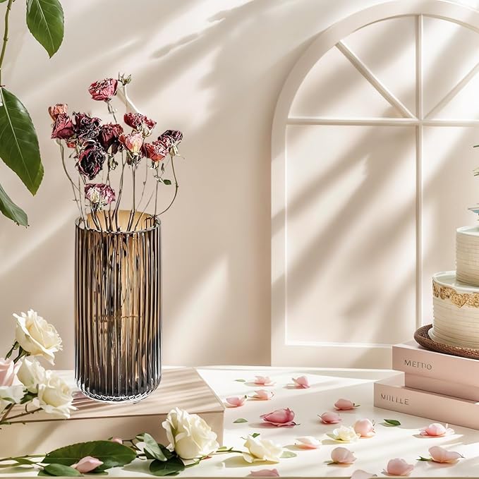 Ekirlin Amber 7.5 inch Flower Vase for Home Decor, Thickened Hand Blow Glass Vase Round Vintage Striped Bottles for Bookshelf,Dinner Table,Indoor Office Desktop,Meeting Room,Bathroom, Best Gift