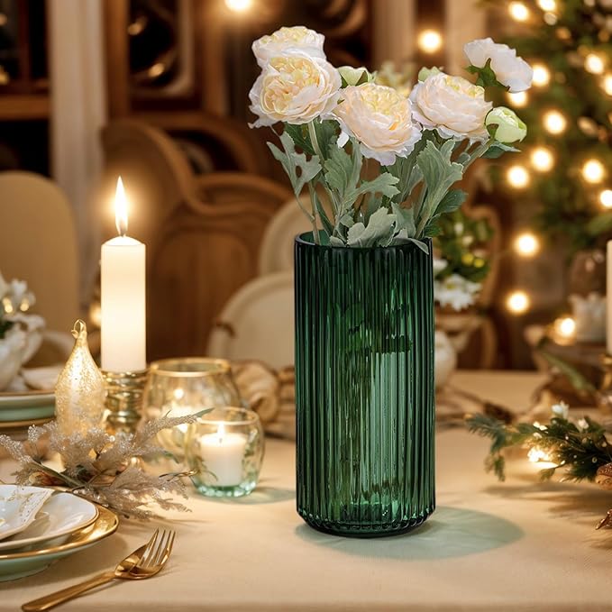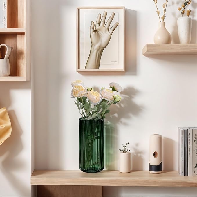 Ekirlin Green 7.5 inch Flower Vase for Home Decor, Thickened Hand Blow Glass Vase Round Vintage Striped Bottles for Bookshelf, Dinner Table, Indoor, Office, Desktop, Meeting Room, Bathroom, Best Gift