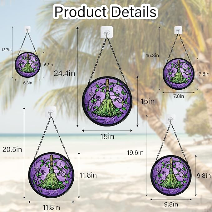 Stained Glass Window Hanging - Halloween Decorations Witch Magic Broom Suncatcher for Doors Garden Indoor Funny Spooky Sun Catchers Gothic Decor Horror Gifts for Women Men Friend 9.8 in