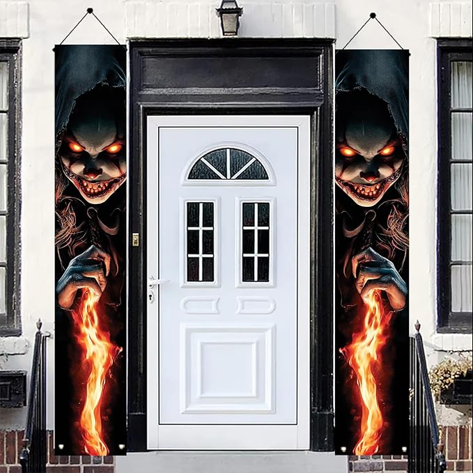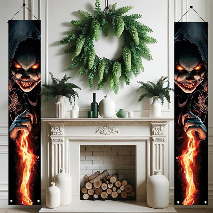 - Scary clown Halloween porch sign: This Halloween clown porch banner features a terrifying evil clown with glowing red eyes and a flaming hand, perfect for adding intense horror to your Halloween décor.