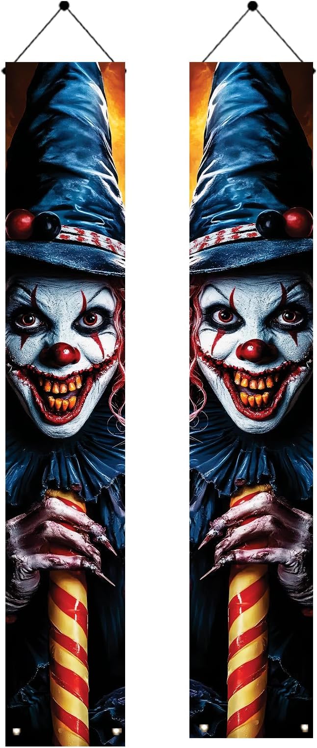- Terrifying Halloween porch banner:This Halloween porch banner features a creepy clown with an evil grin, perfect for setting a haunted and thrilling scene for Halloween porch banner setups.