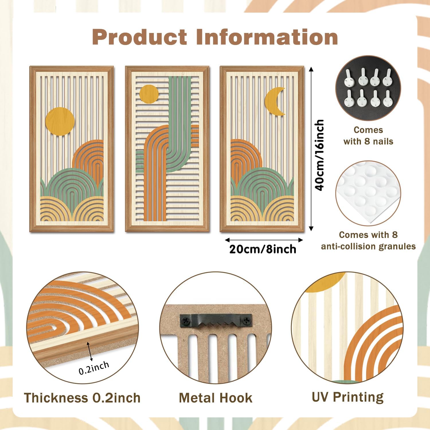 - Size for Easy Displaying:Boho minimalist wooden decor each piece measures 20x40cm (7.9 x15.8 Inch). On the back of the Bohemian art painting, we have installed serrated hooks and the accompanying hardware includes 8 seamless nail and collision resistant particles. Easy to operate, you just need to find a suitable position to hang or disassemble directly