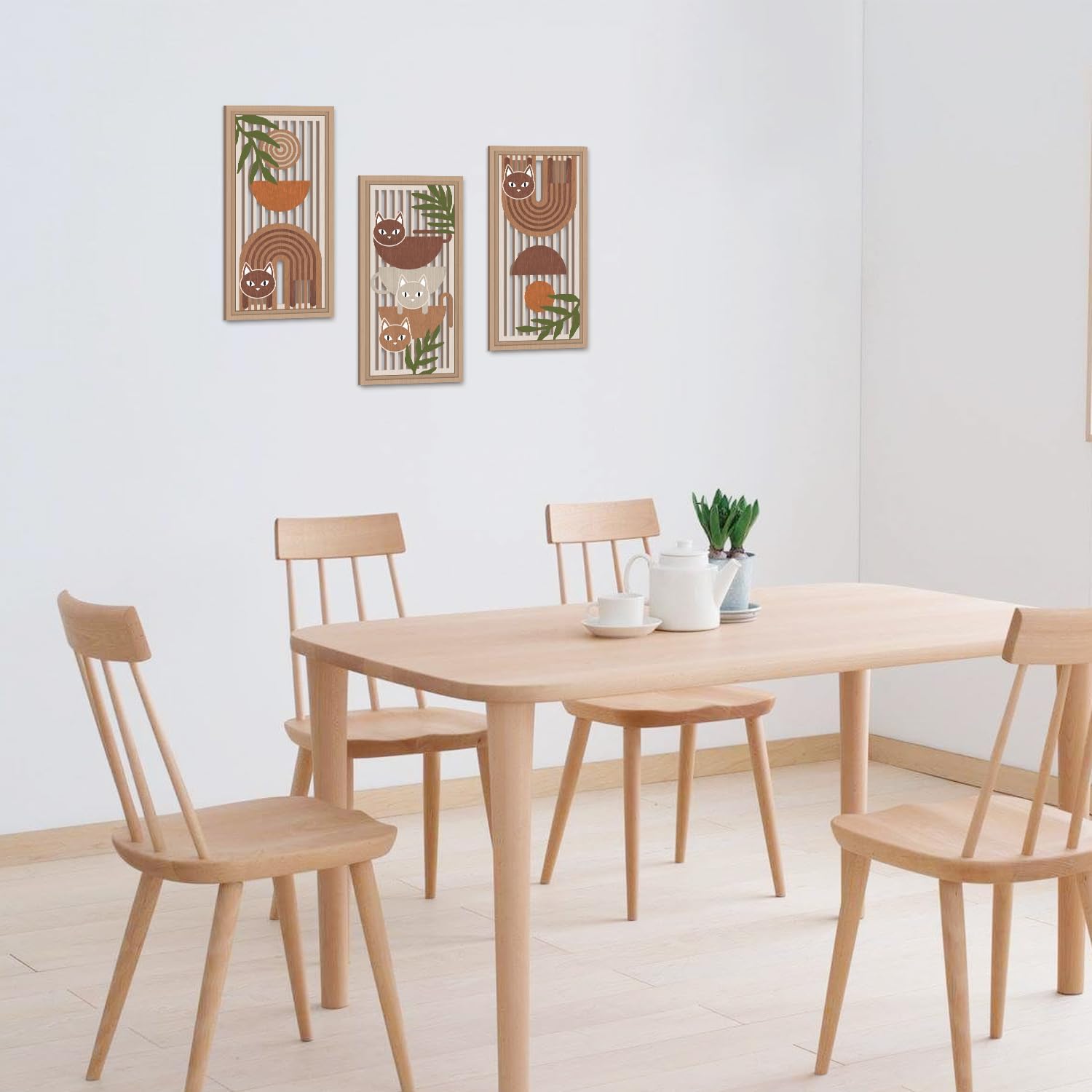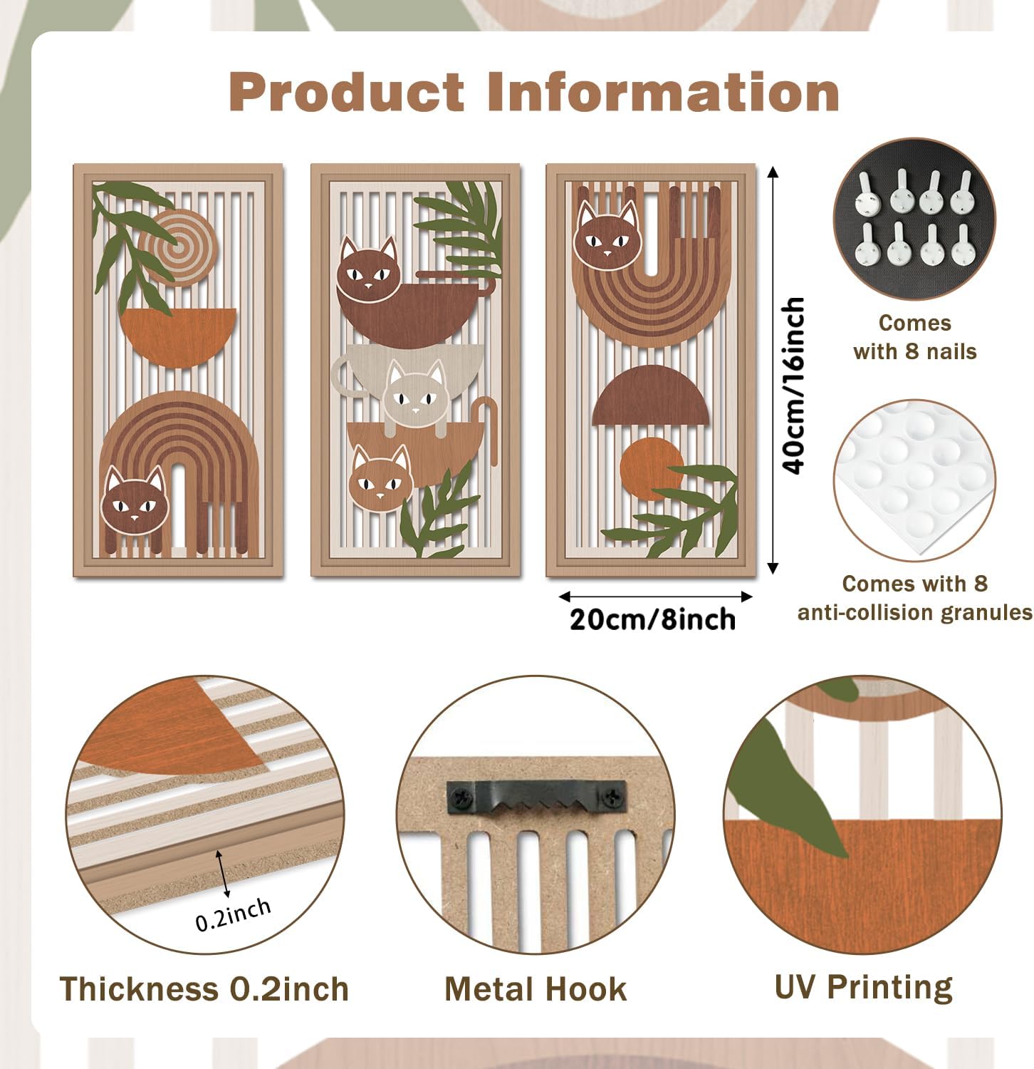 - Size for Easy Displaying:Cat room wood wall decor each piece measures 20x40cm (7.9 x15.8 Inch). On the back of the Bohemian art painting, we have installed serrated hooks and the accompanying hardware includes 8 seamless nail and collision resistant particles. Easy to operate, you just need to find a suitable position to hang or disassemble directly