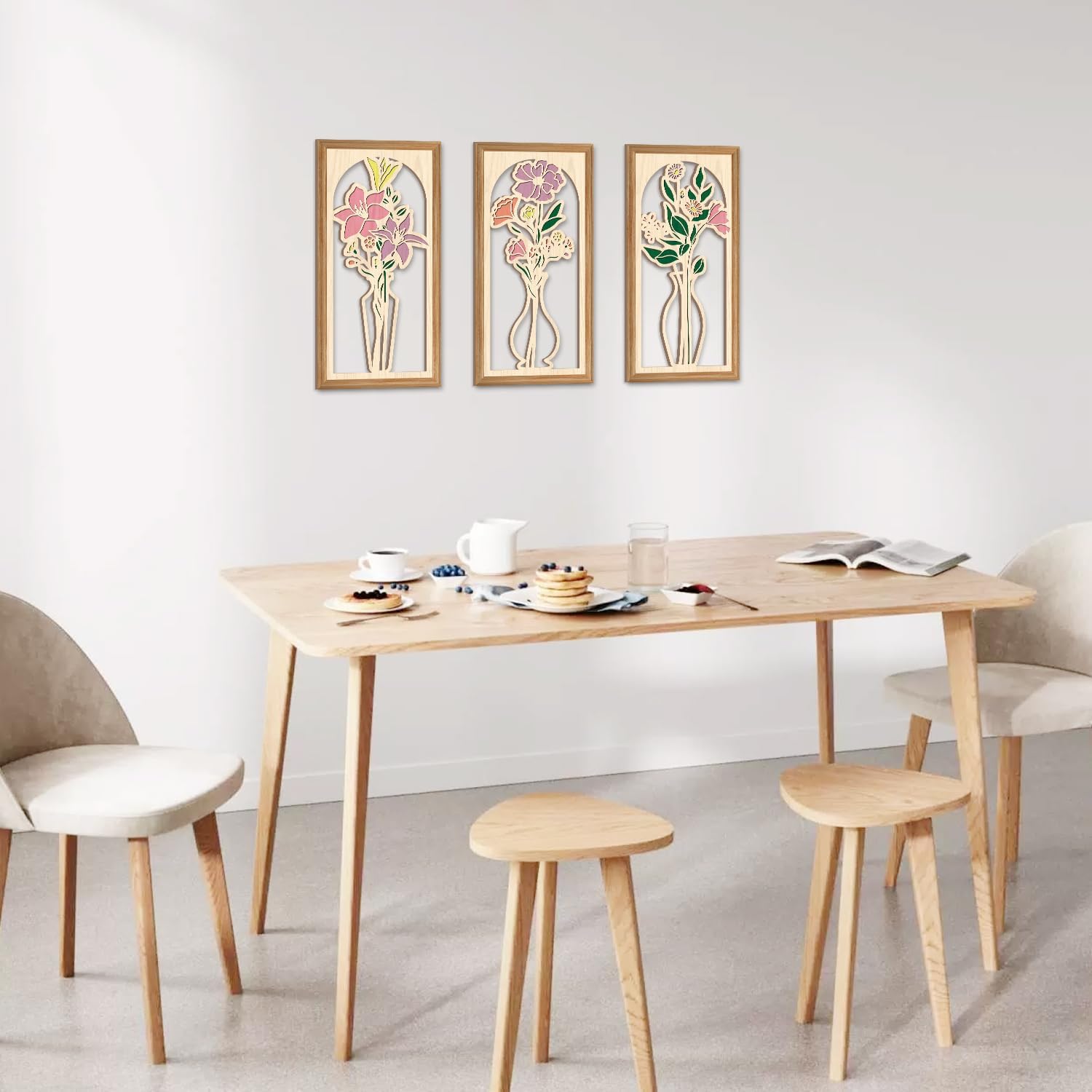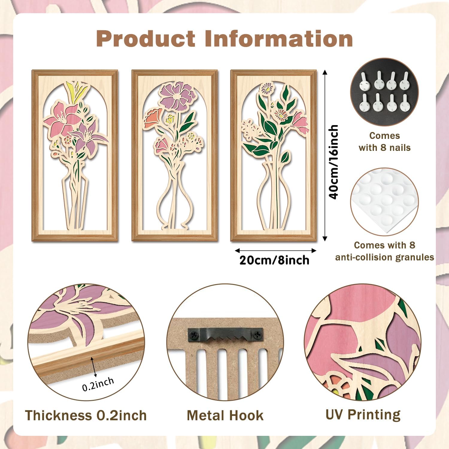 - Bohemian Hollow Design:3pcs boho floral wall decor combines modern bohemian aesthetic design, showcasing an exquisite and abstract vase flower hollow pattern. The combination of retro wood color and light and shadow will add charm to your room design