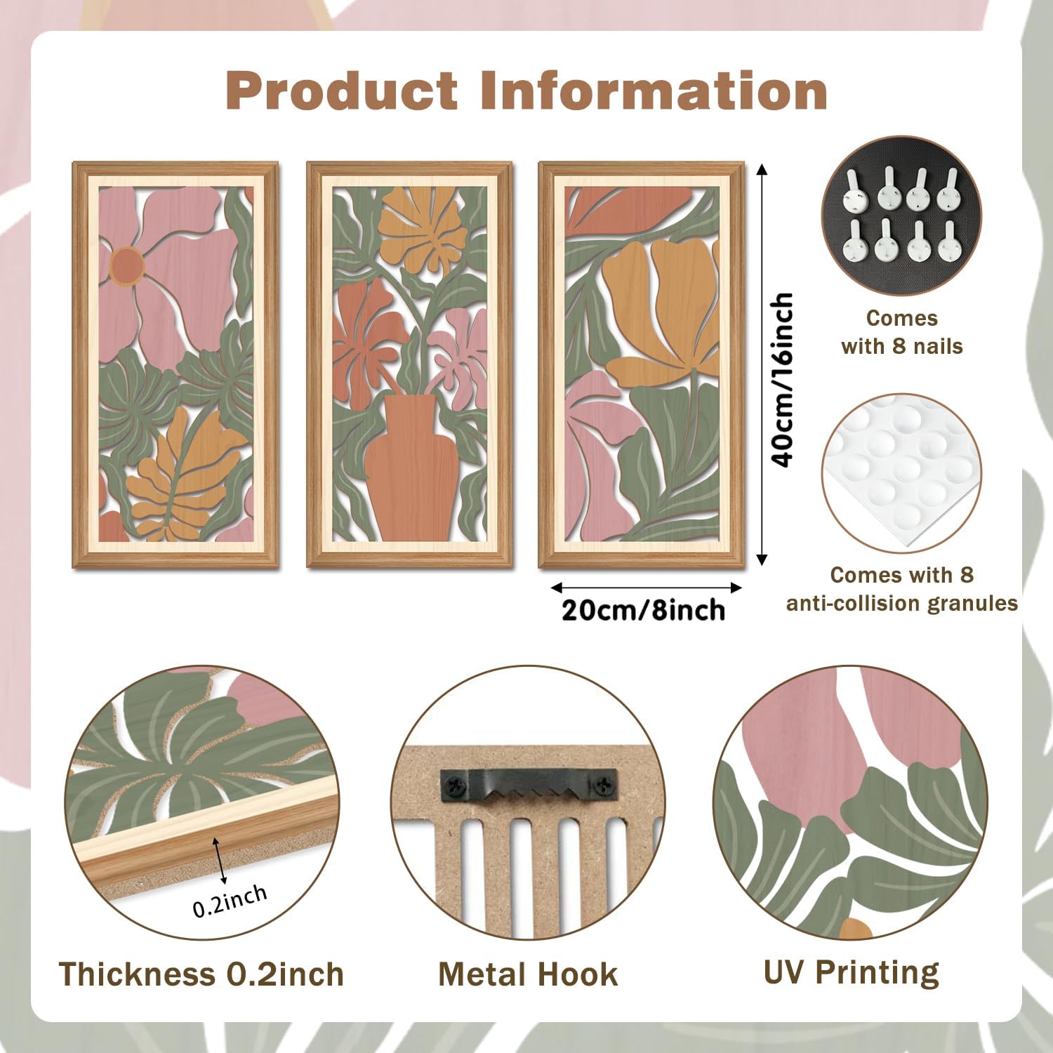 - Bohemian Hollow Design:Bohemian wall decor feature colorful retro tones,with abstract patterns of flowers, plants, and vases.Boho abstract wall art combines exquisite hollow carving design, and the combination of retro wood color and light and shadow will add charm to your room design
