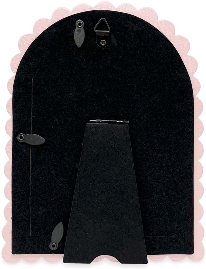 - FRAME DESIGN: Simple and stylish this resin arc shaped frame features a layered design and comes in eight colors. It can easily be hung on the wall using the hanging hook on the velvet back or be propped up on any tabletop, shelf, or dresser using the easel stand.
