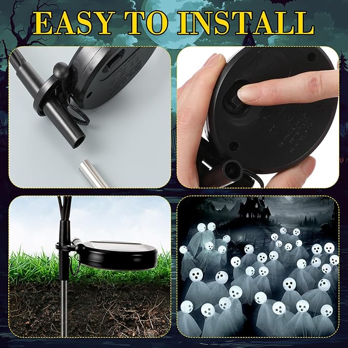 - Easy to Install: the upper part of our Halloween lights solar are the ghost decors and solar panels, and the lower part is the bracket, assembled them together and then place them where you want, easy to install and no other tools are required; The built-in light sensor will ensure that Halloween lights automatically turn on at dusk and turn off at dawn, saving you time and providing a ghost atmosphere all night long