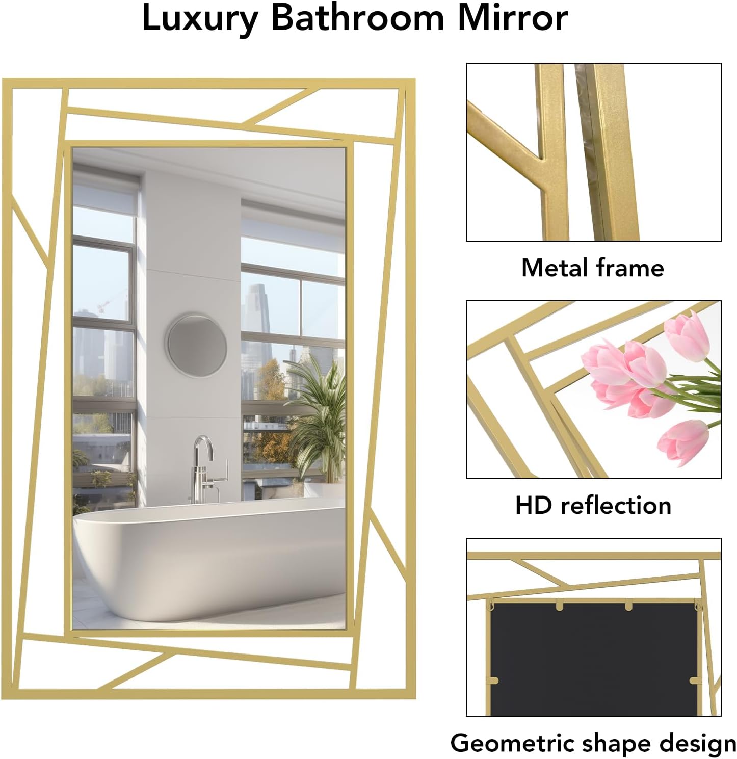 Gold Bathroom Mirror, 36''X24'' Decorative Wall Mirrors with Geometric Metal Frame for Living Room, Bedroom, Bathroom, Entrance, Expands Space, Horizontal/Vertical
