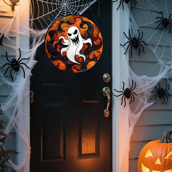 Stained Glass Window Hanging - Halloween White Ghost Suncatcher for Doors Window Garden Indoor Spooky Funny Orange Sun Catchers Gothic Decor Horror Gifts for Women Men Friend 6.3 in