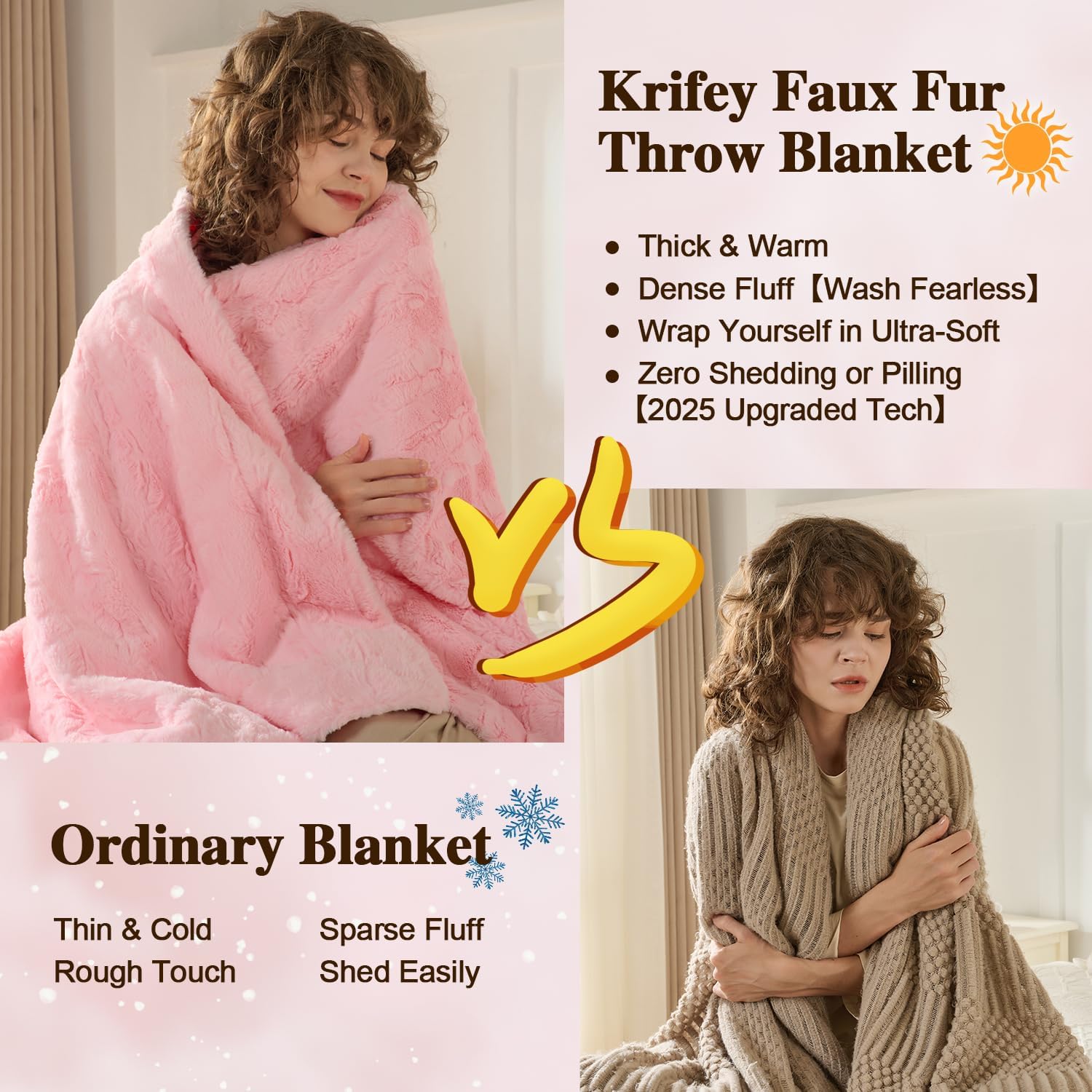 Krifey Faux Fur Throw Blanket for Couch, 3D Marble Texture Soft Throws, Cozy Fuzzy Plush Thick Warm Blanket, Faux Rabbit Fleece, Christmas Birthday Gifts for her Girls Women Mom, Cute Pink, 50x60in