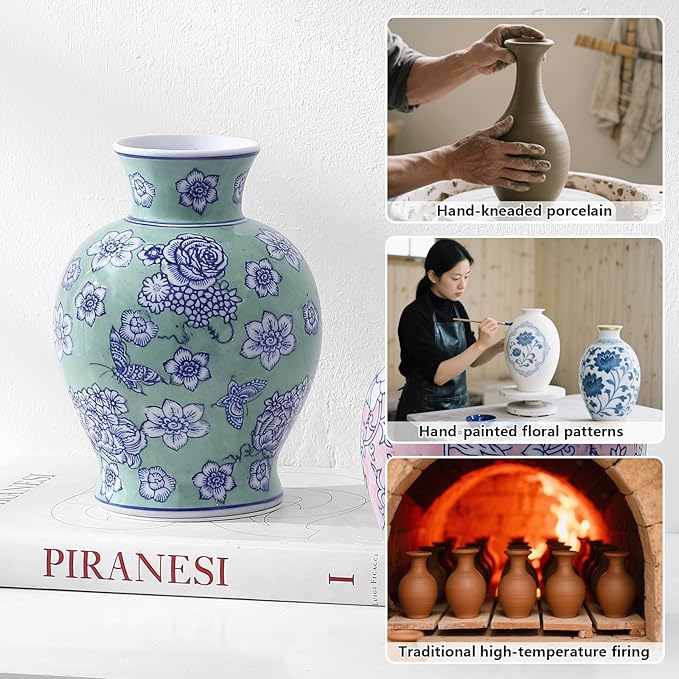 Vintage Chinoiserie Floral Ceramic Vase, Large Rustic Pottery Vases for Living Room, Entryway, Dining Table Centerpiece, Farmhouse Home Décor, Floor or Tabletop Flower Vase, (Green)
