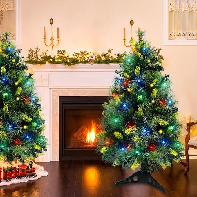 - 2 Pack Artificial PE Fraser Fir Christmas Tree: This package includes 2 Pack Christmas Porch Trees, Dimensions: 41 Inch (H) x 26 Inch (W). Each tree boasts remote controls and 50 LED multi-color changing Lights. You can easily place it in your front yard or garden and enjoy its beautiful glow at night.